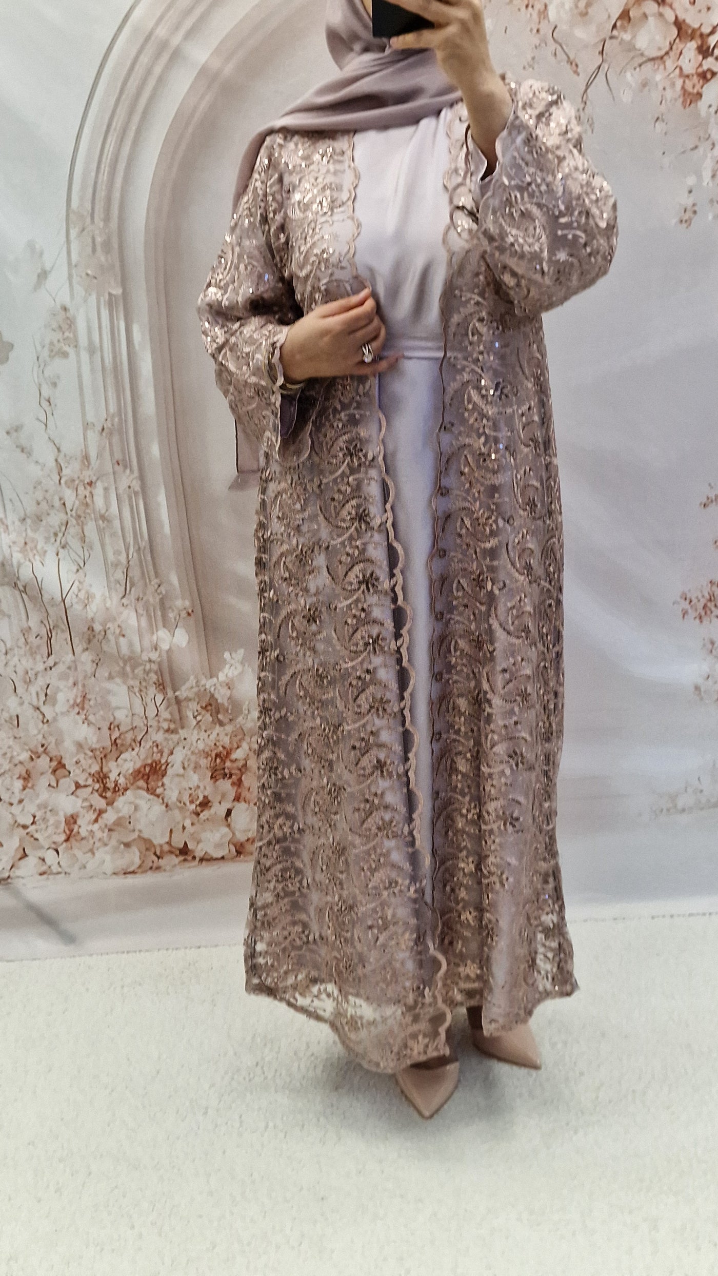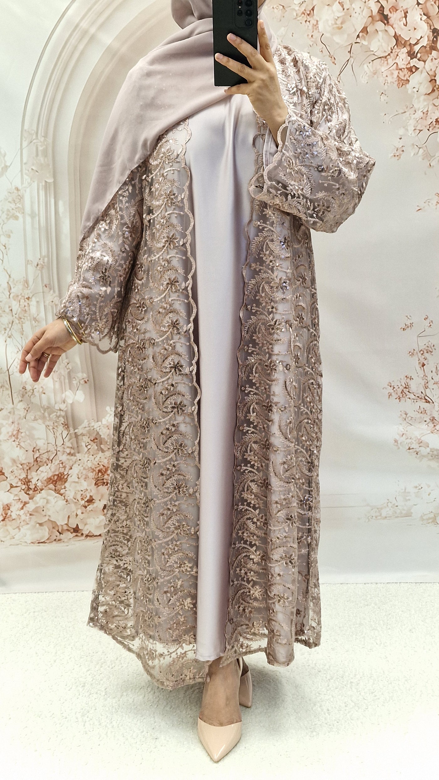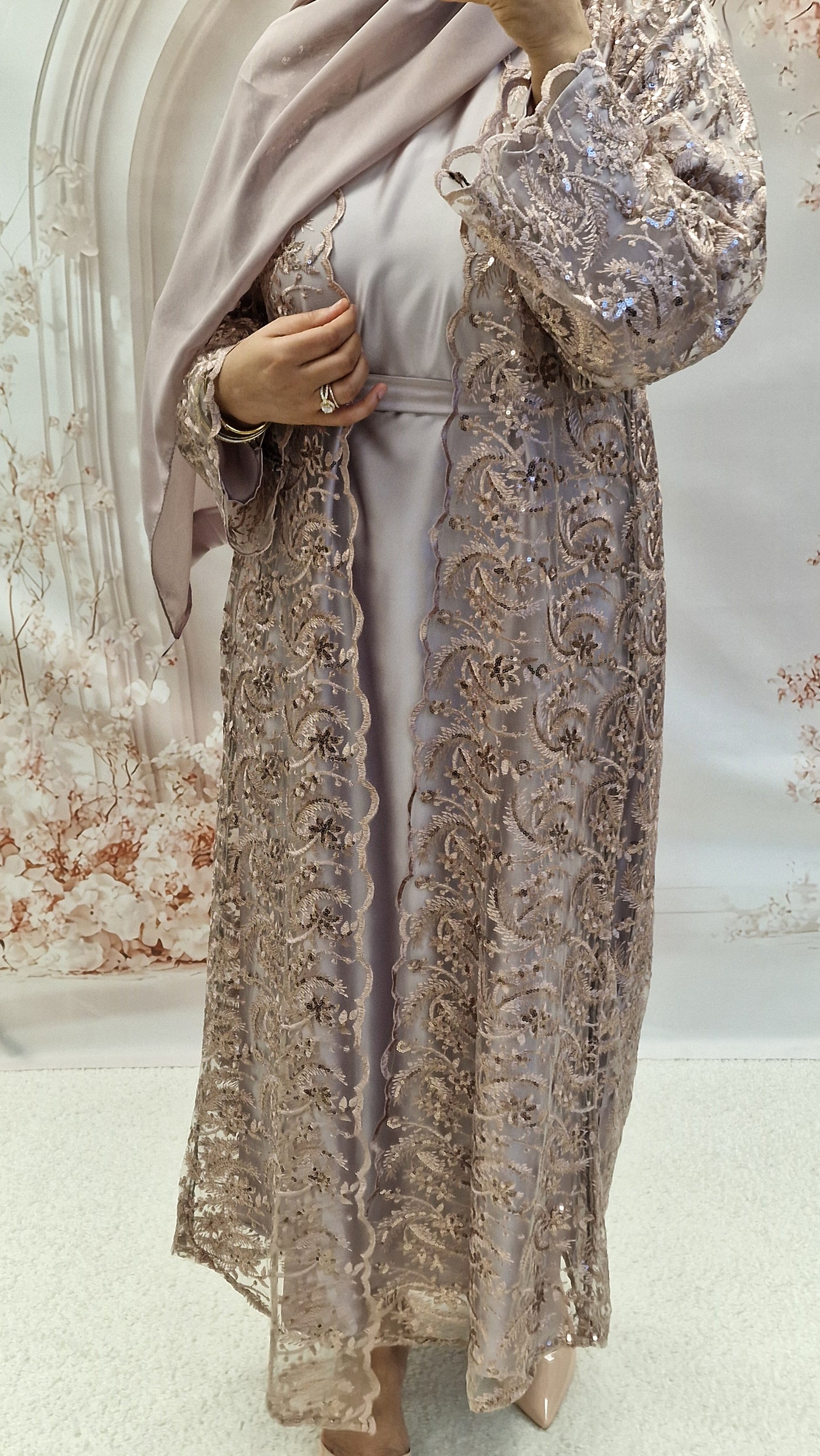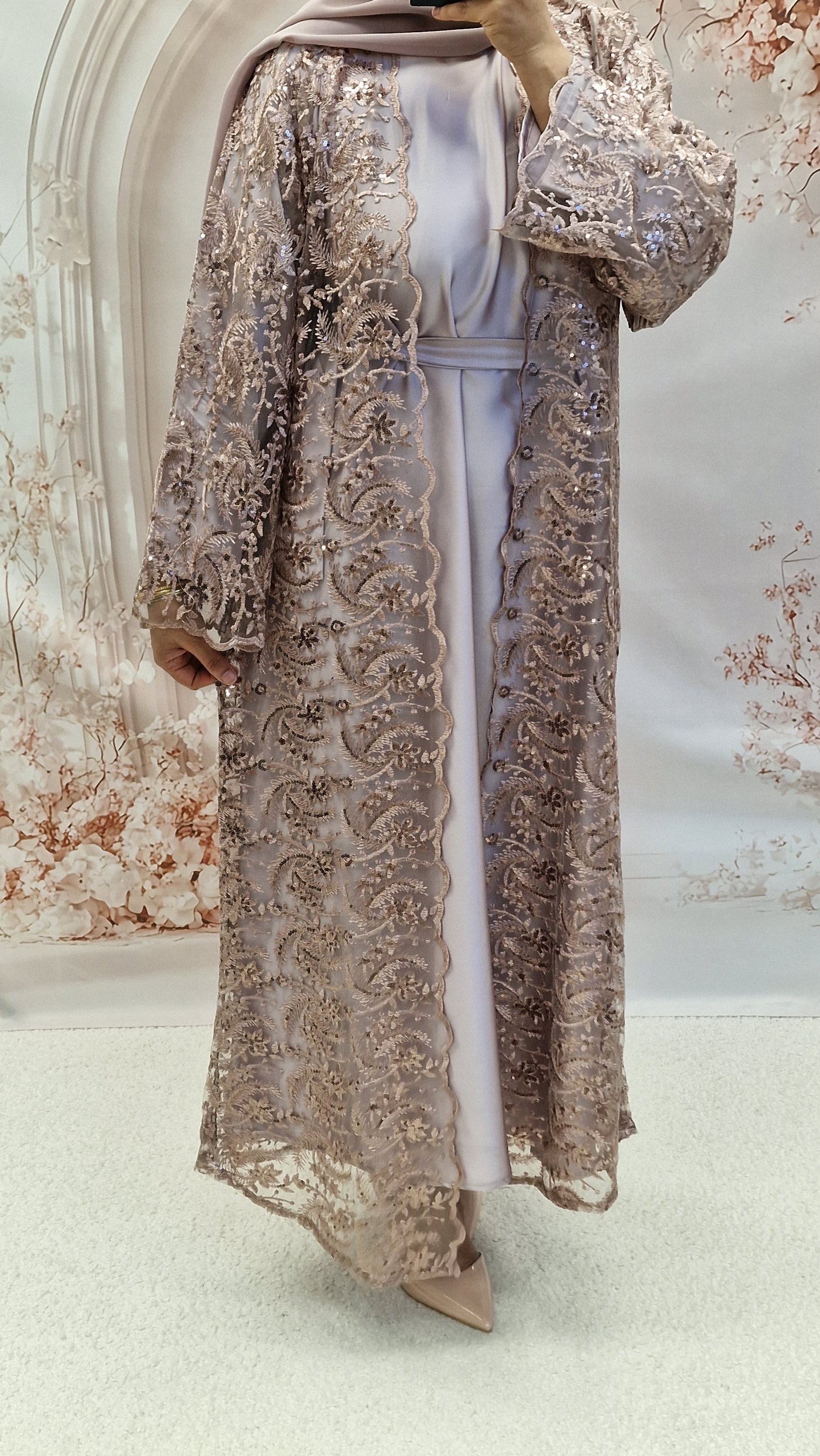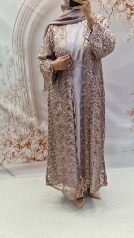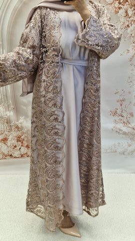 The absolutely stunning open abaya. The new net open abaya with silk full sleeves abaya a detachable belt and matching hijab.