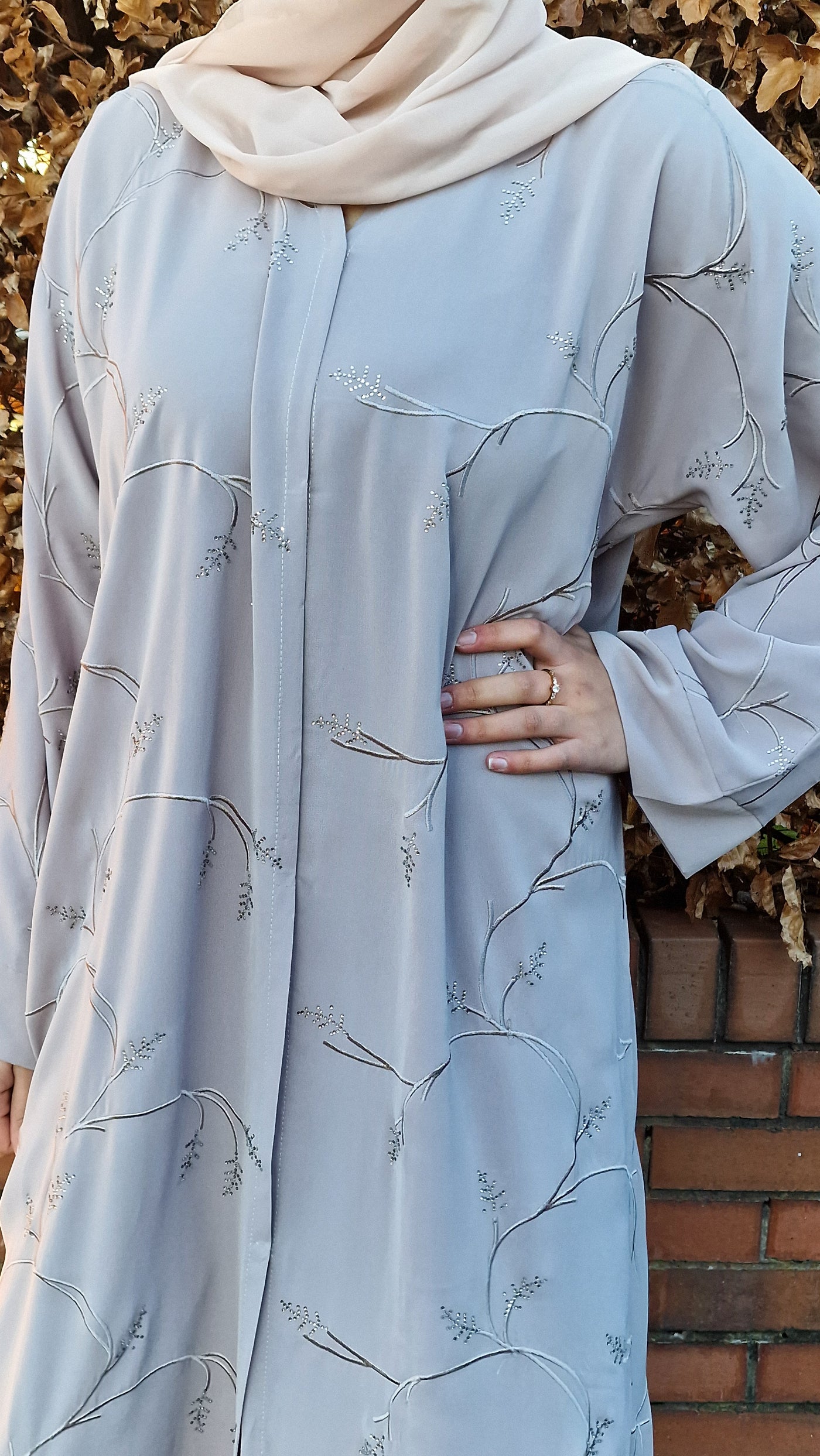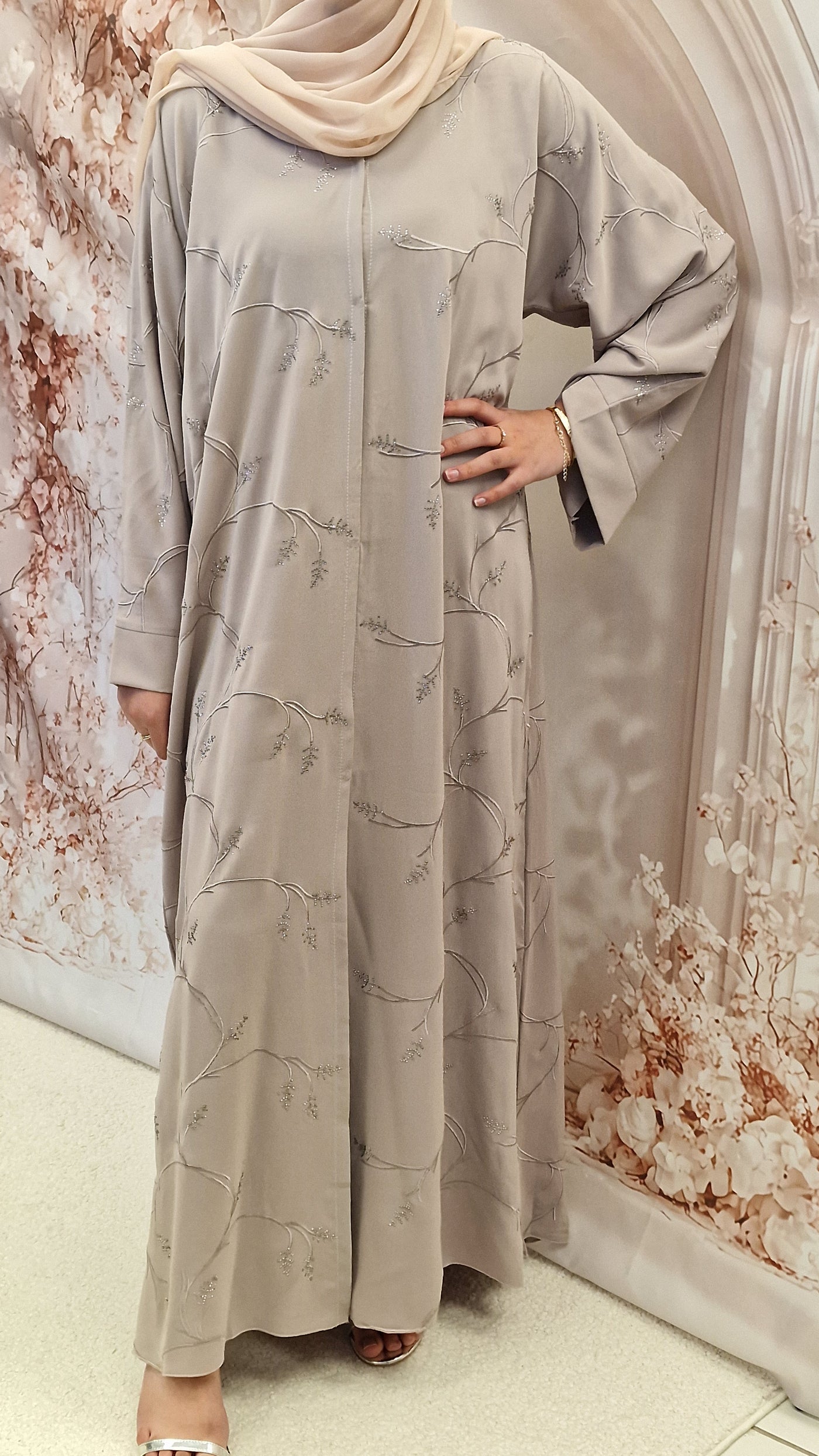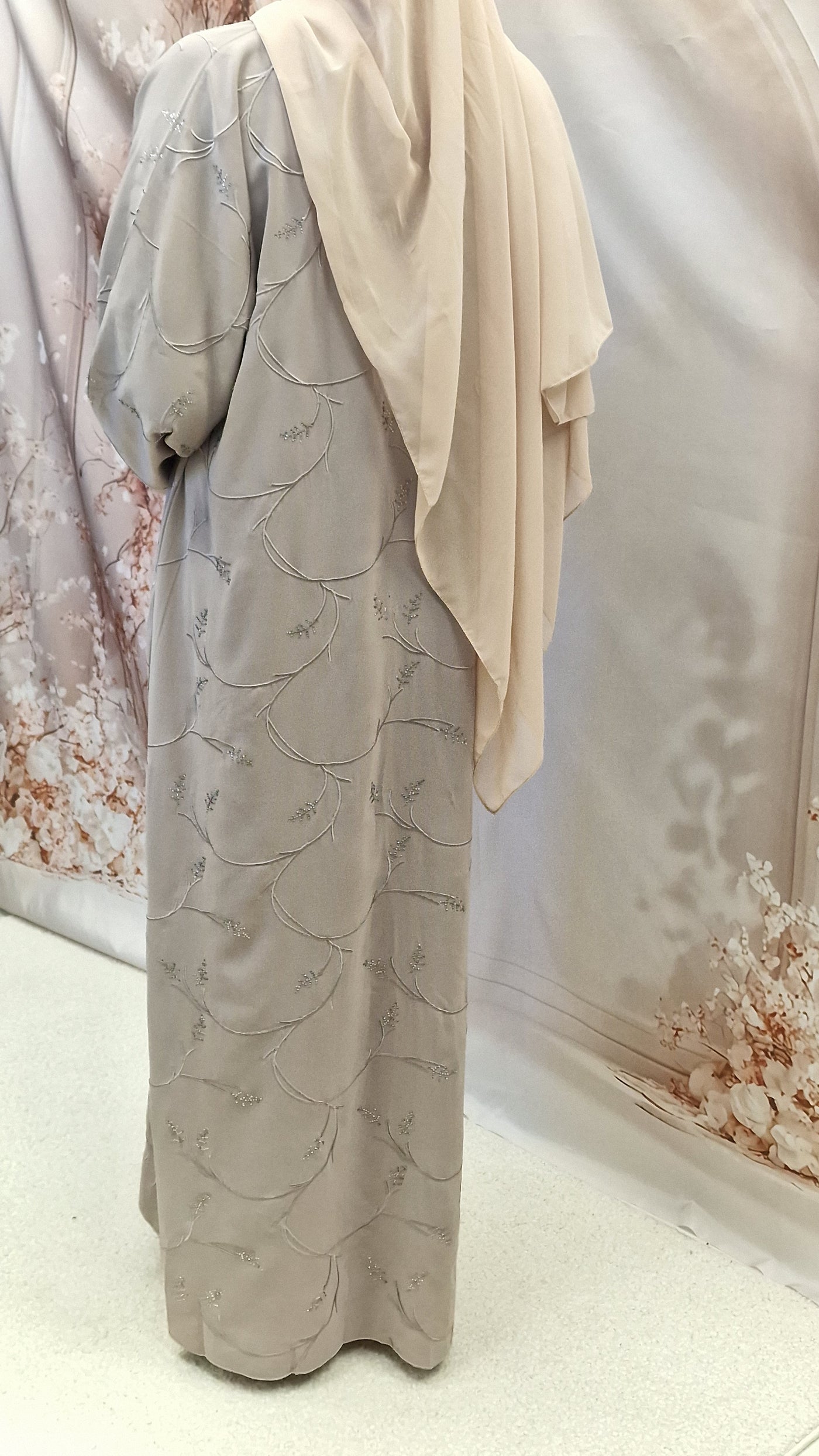 The abaya can be worn open styled with a slip dress or closed . Button fastening.