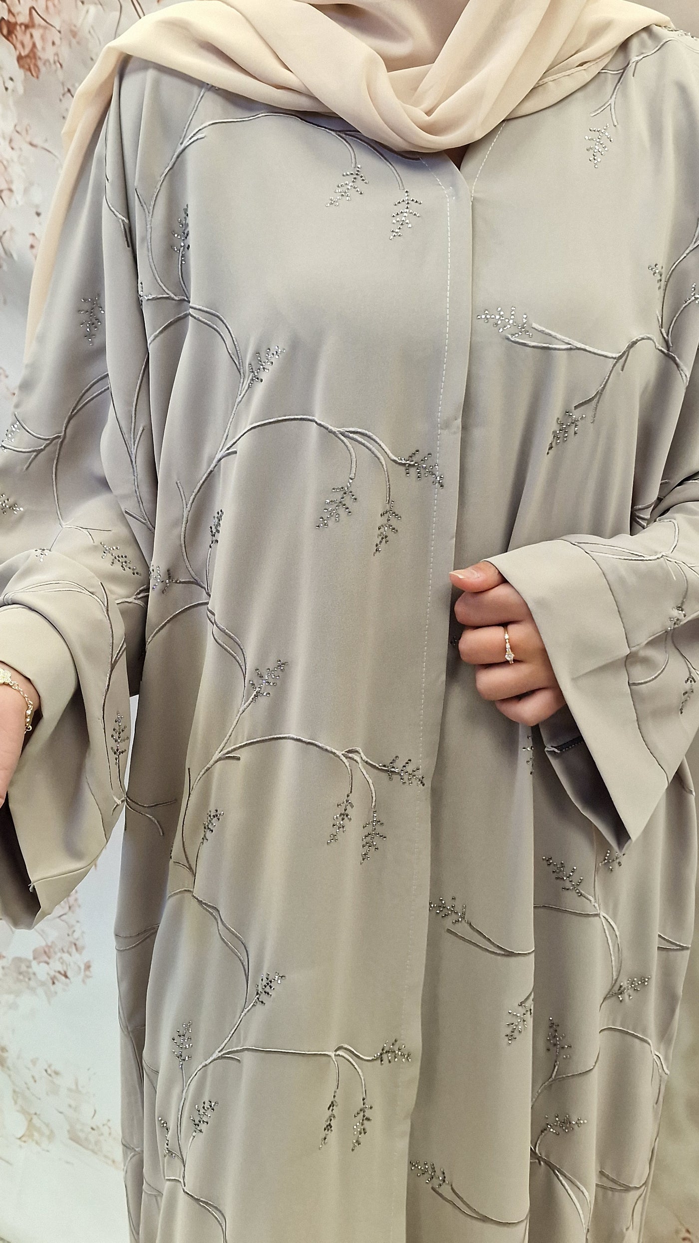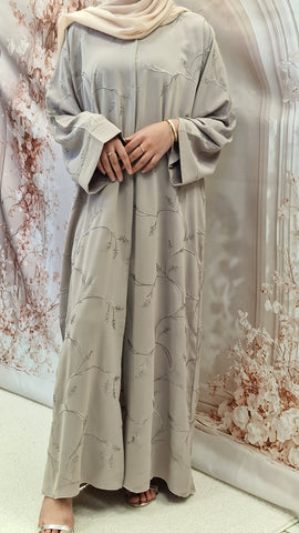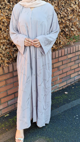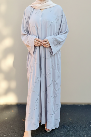 The stylish open abaya in nida fabric. Fine embelishment detail with thread emboirdery on whole abaya.