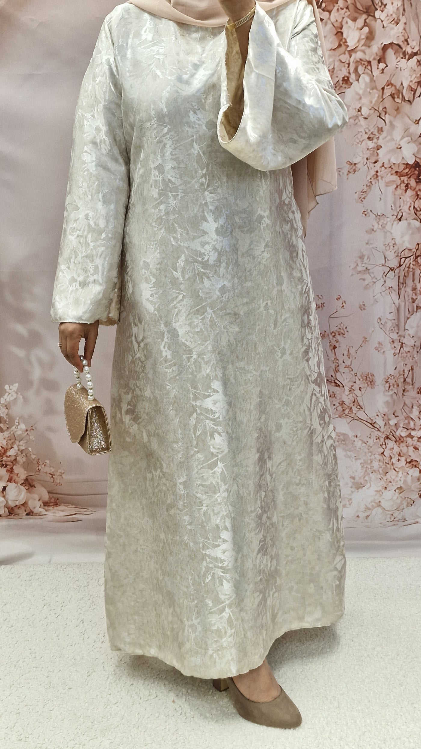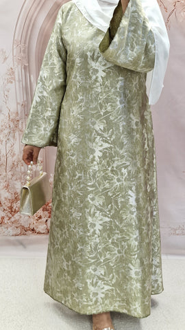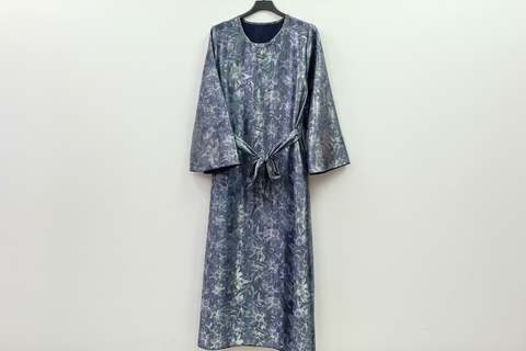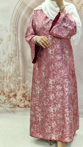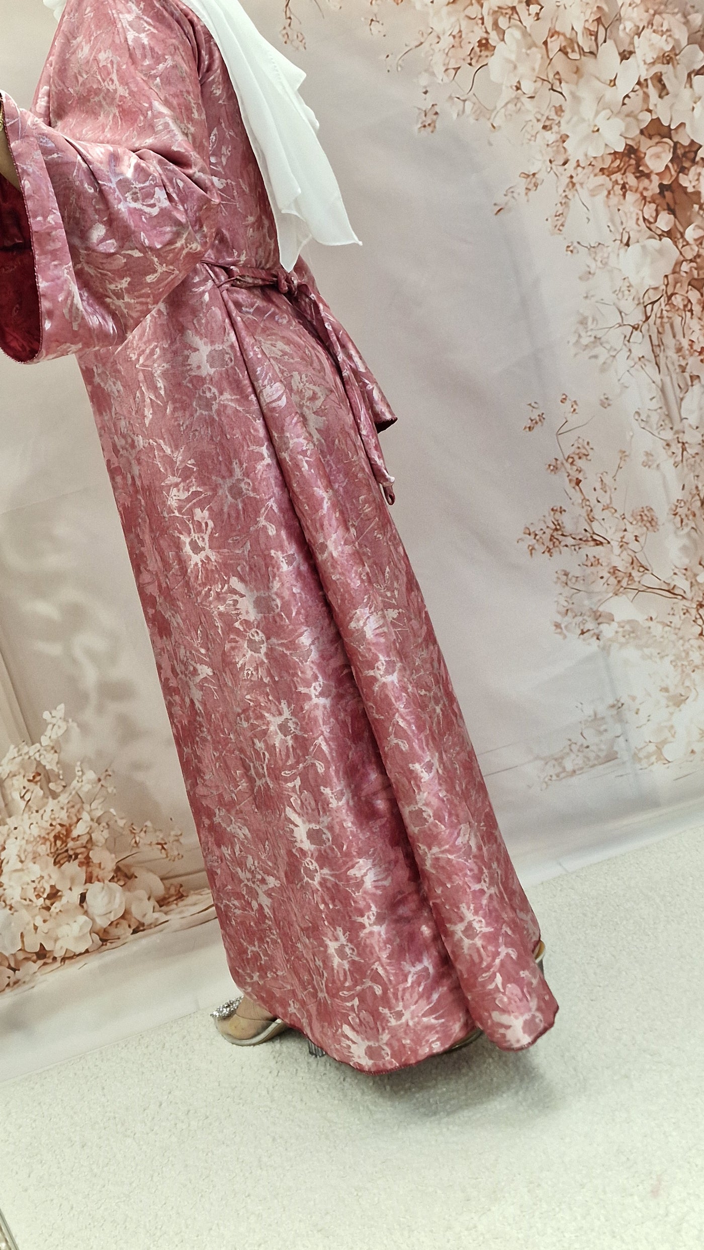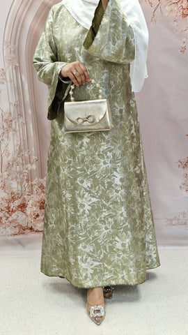 Stunning satin self print print maxi. This beautiful maxi dress comes with a detachable belt,rounded neckline and bell style sleeves.