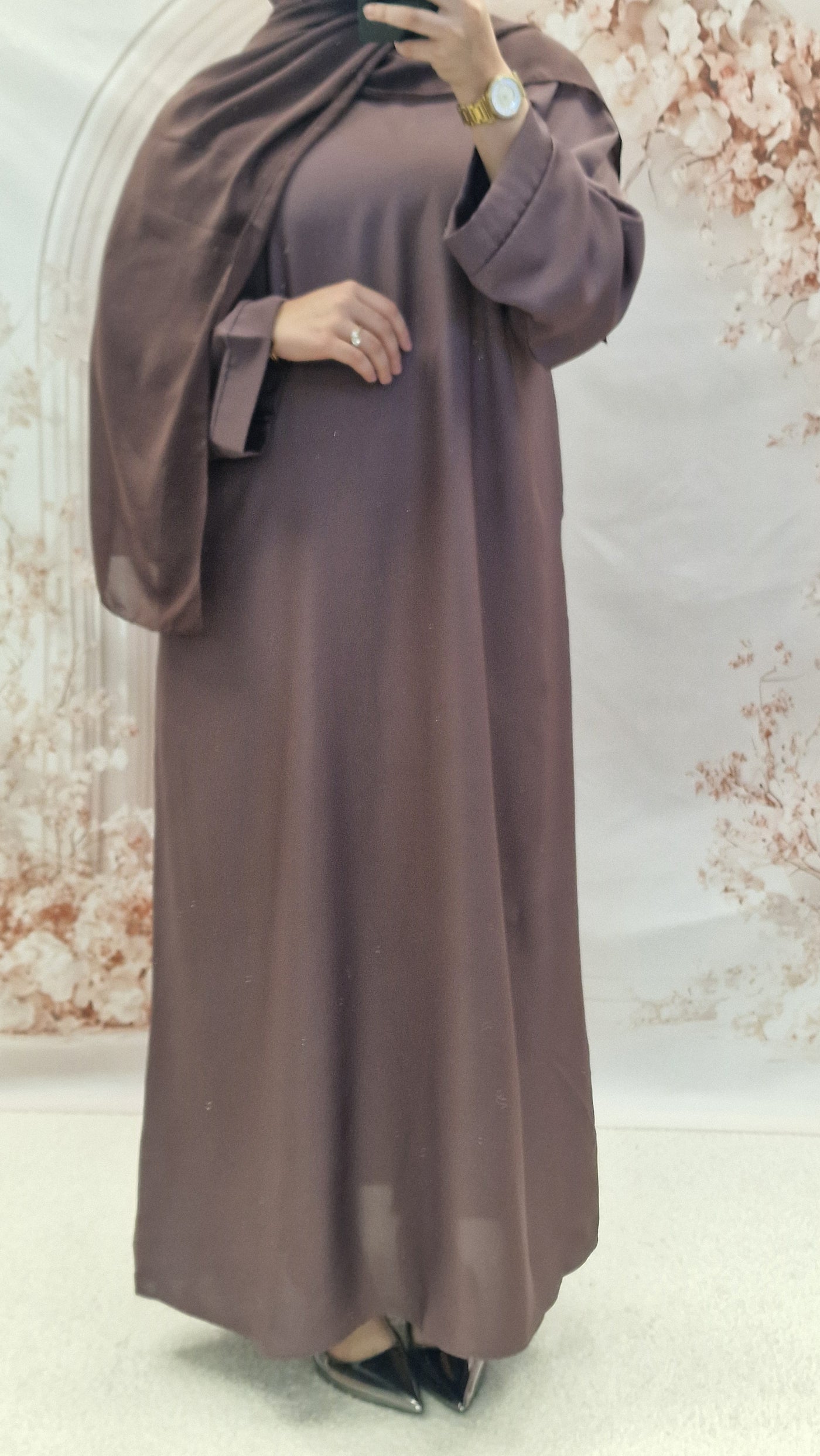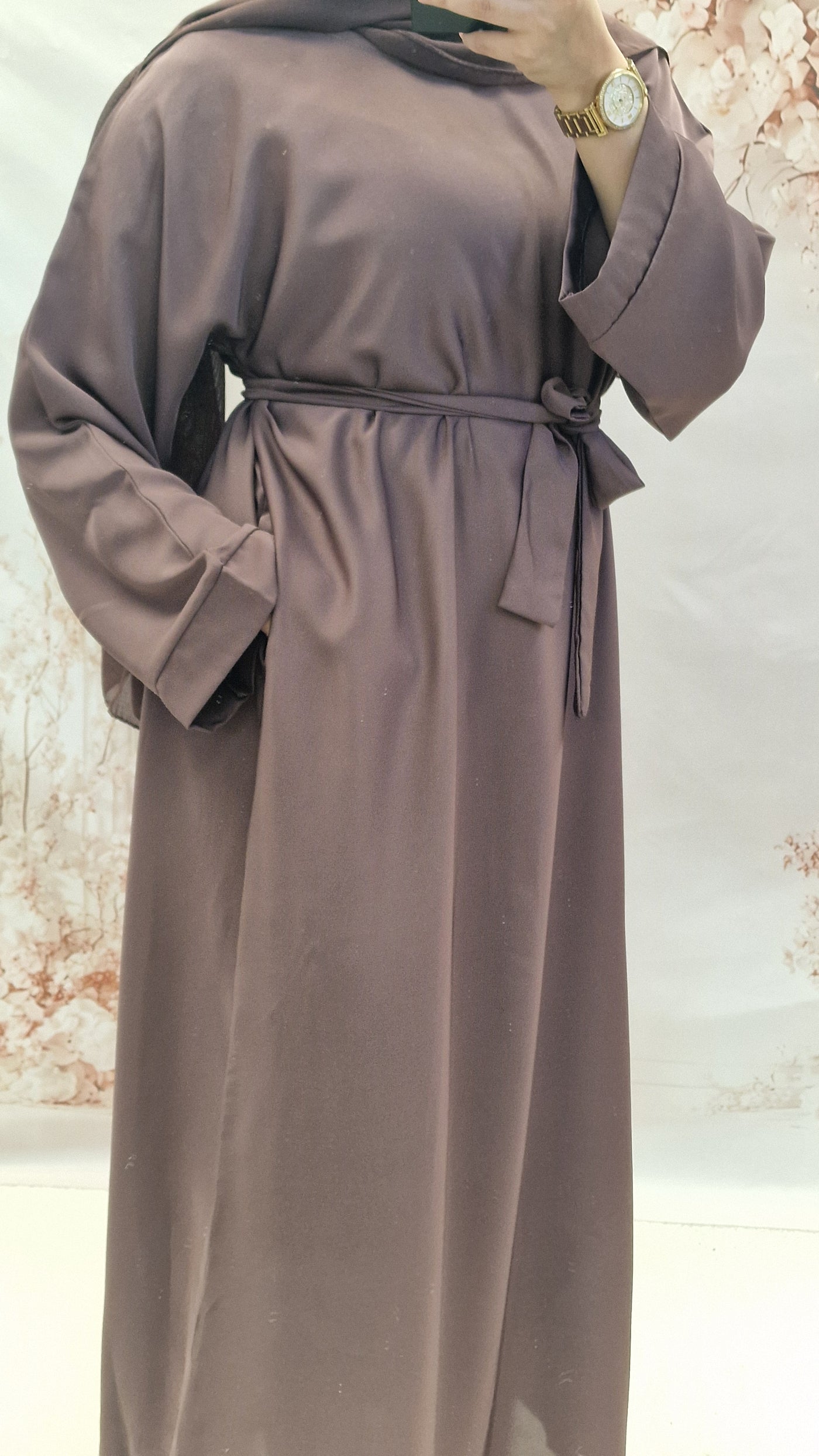 Beautiful flowy abaya with a detachable belt and matching scarf.