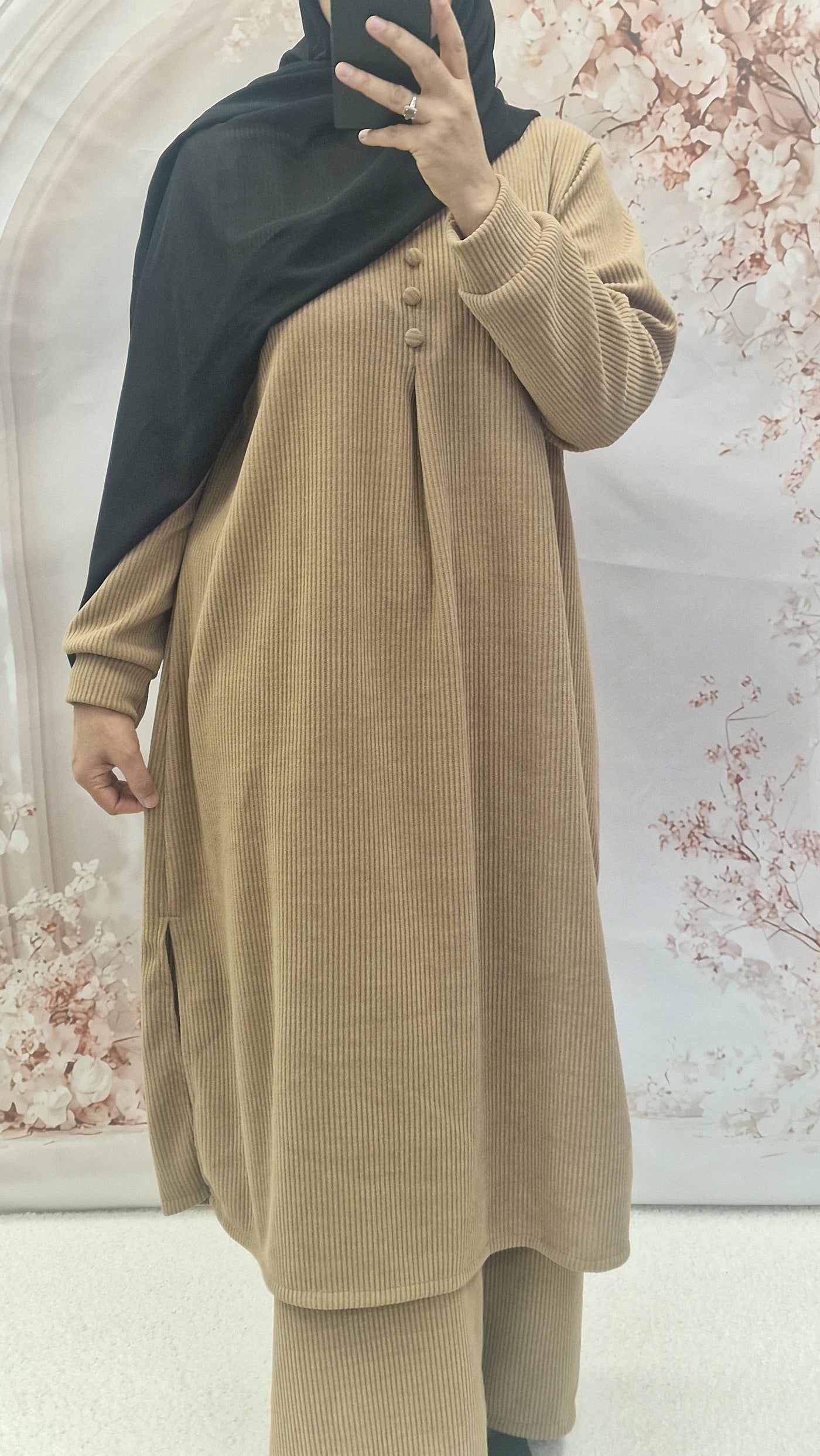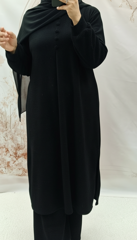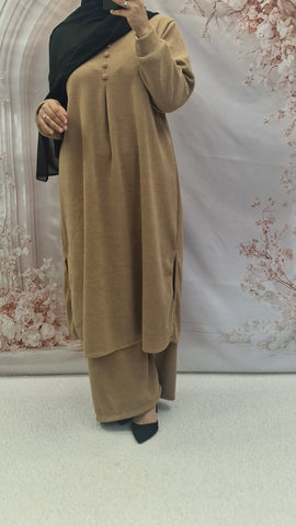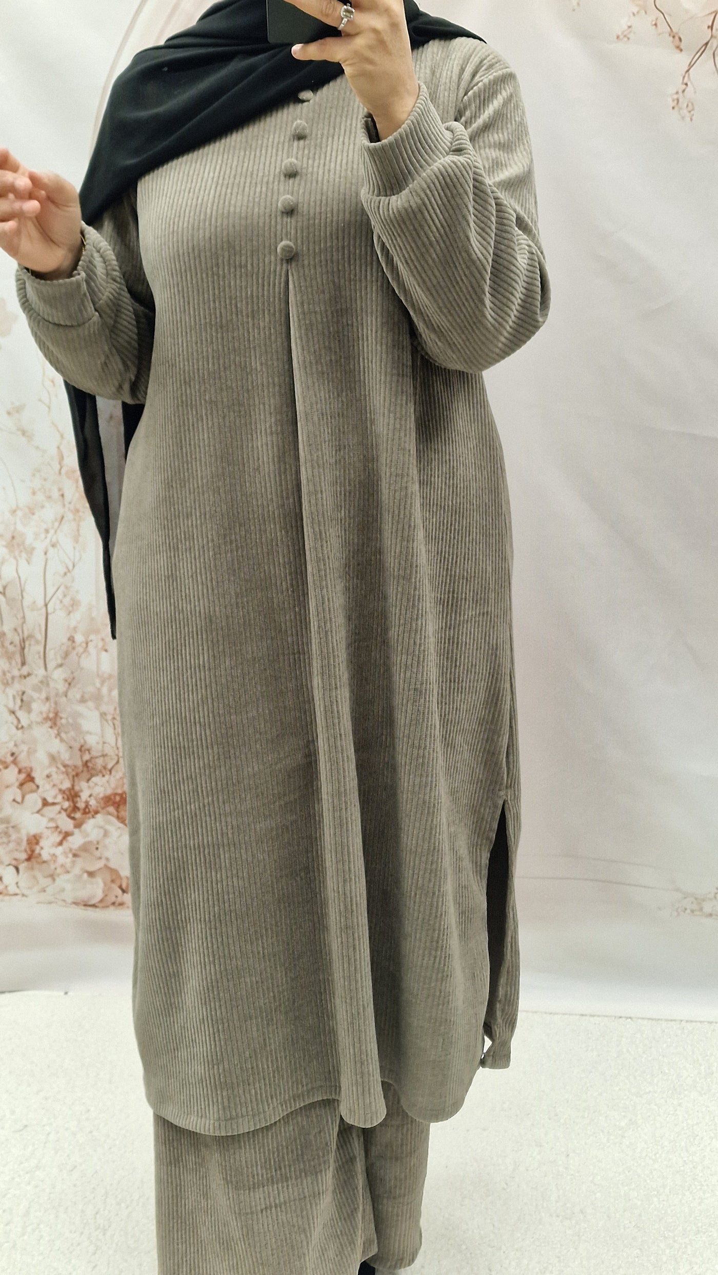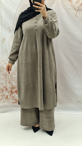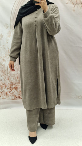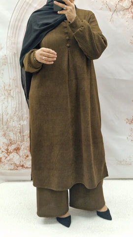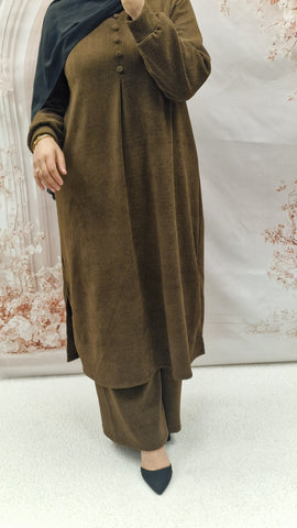 Keep warm with this autumn/winter co ord set. Long length top with striaght cut sleeves and a rounded neckline with button detailing. Textured warm cordoury fabric.