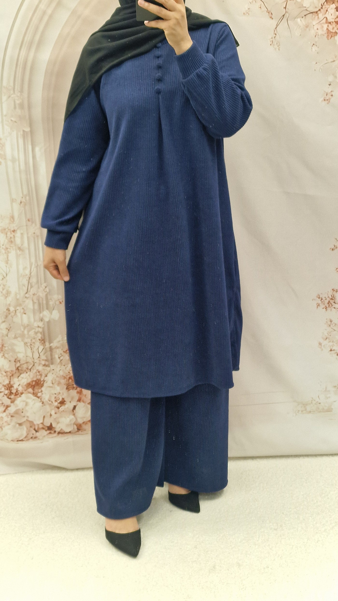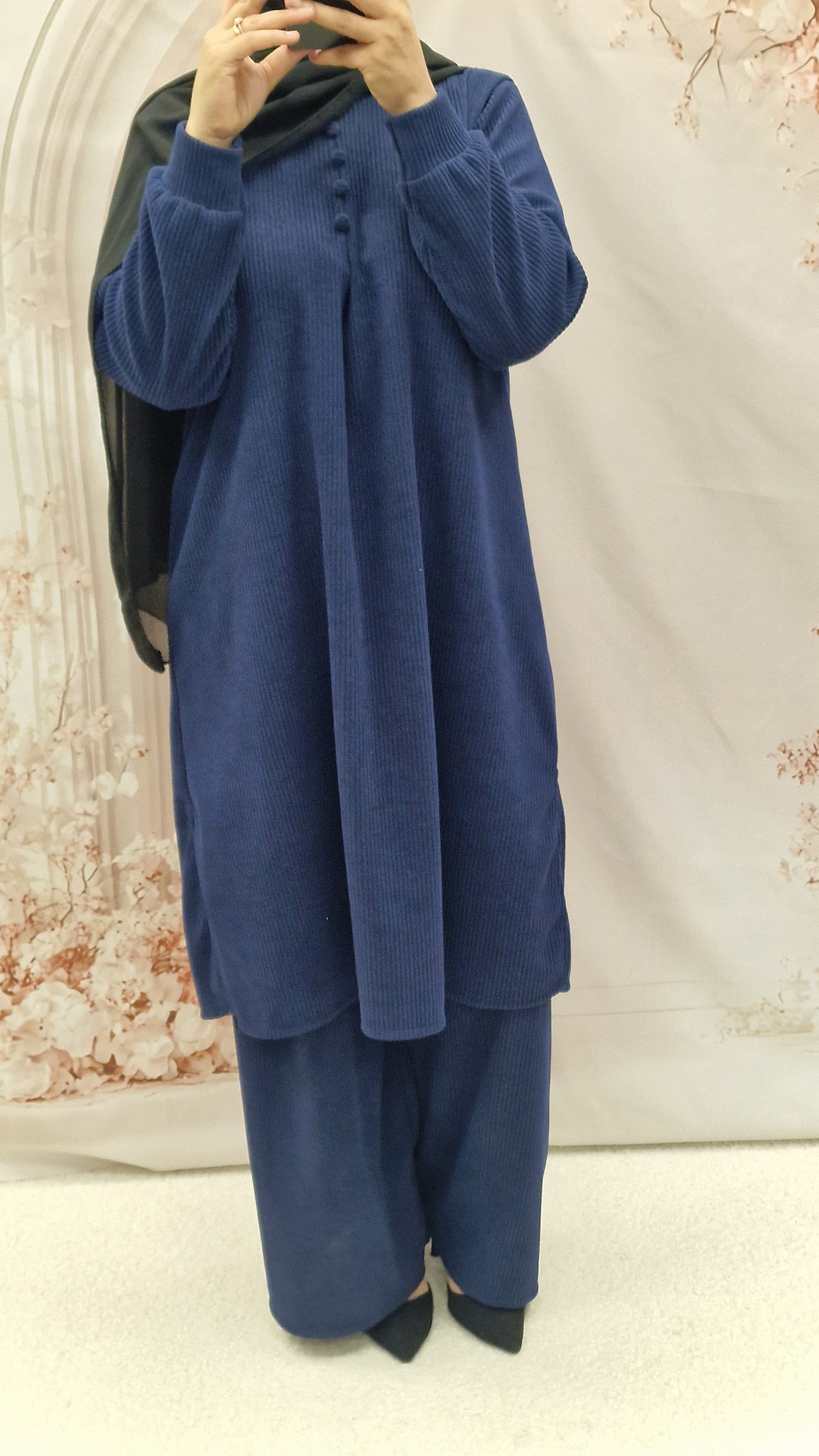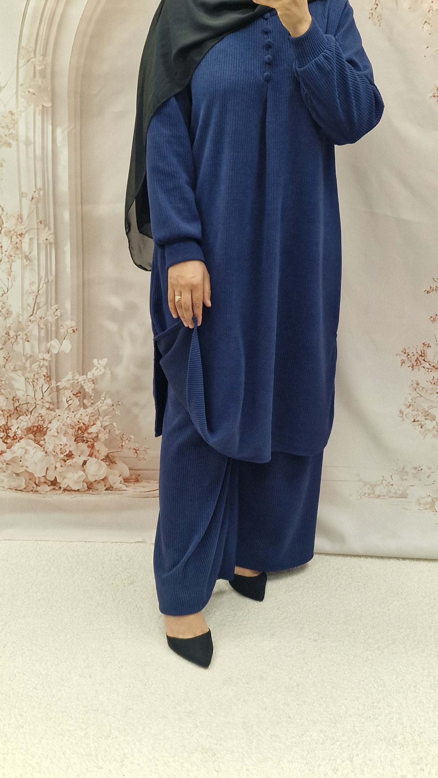 Keep warm with this autumn/winter co ord set. Long length top with striaght cut sleeves and a rounded neckline with button detailing. Textured warm cordoury fabric.
