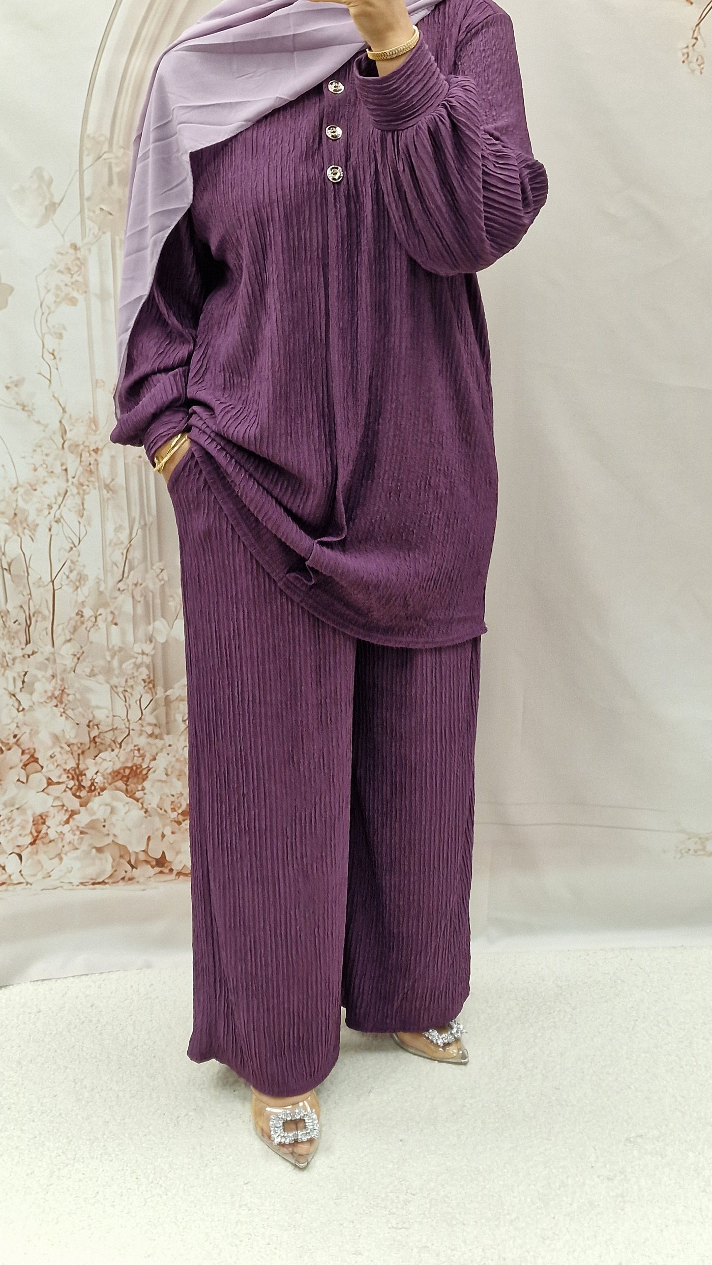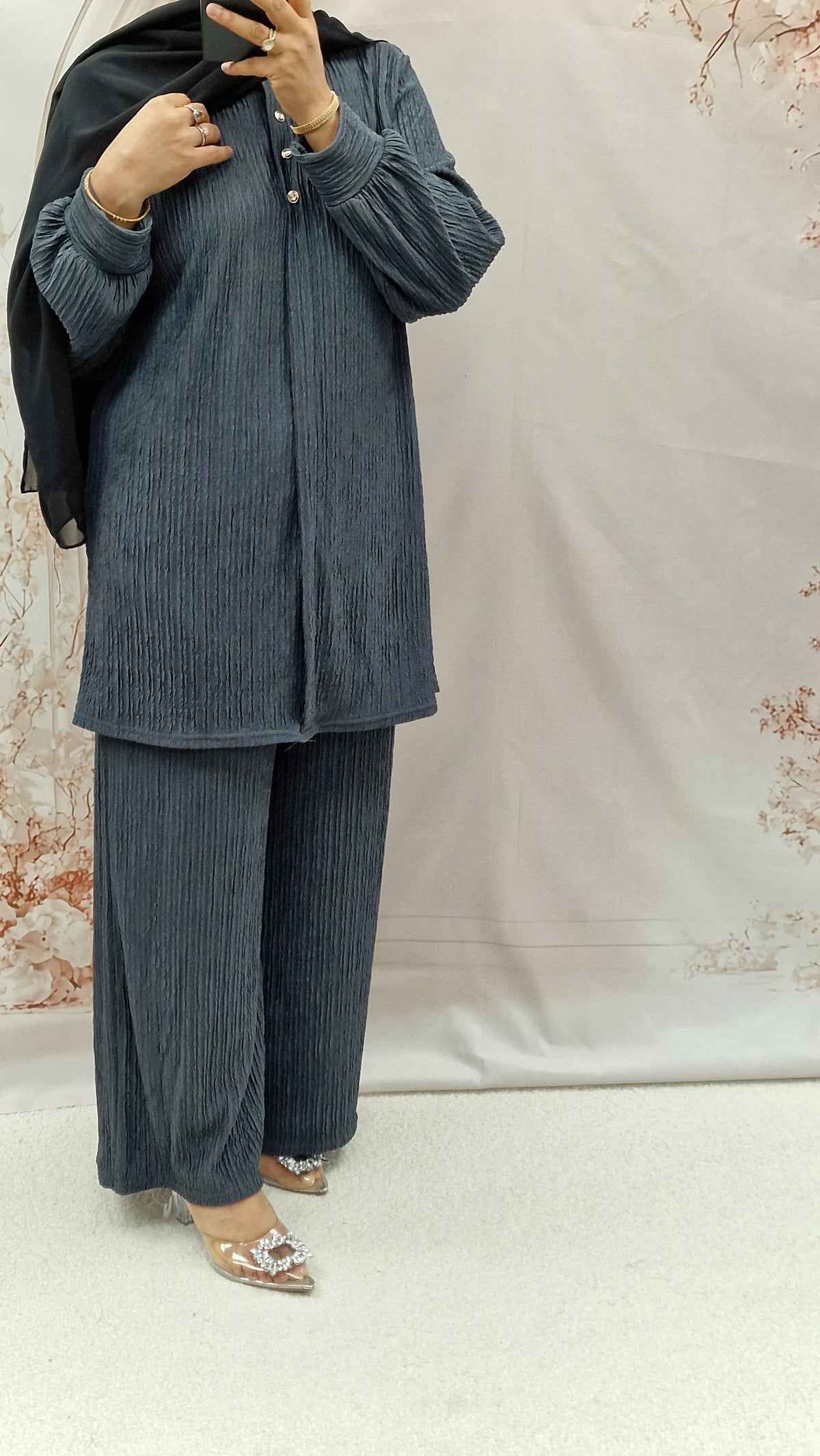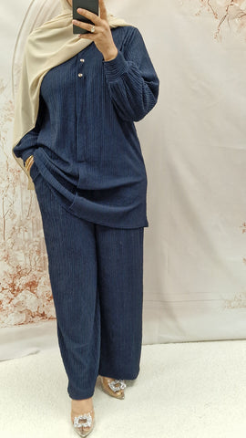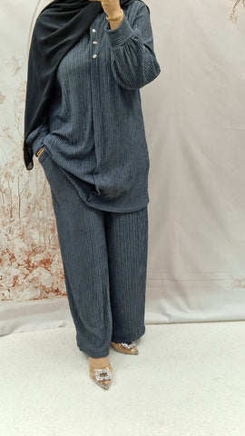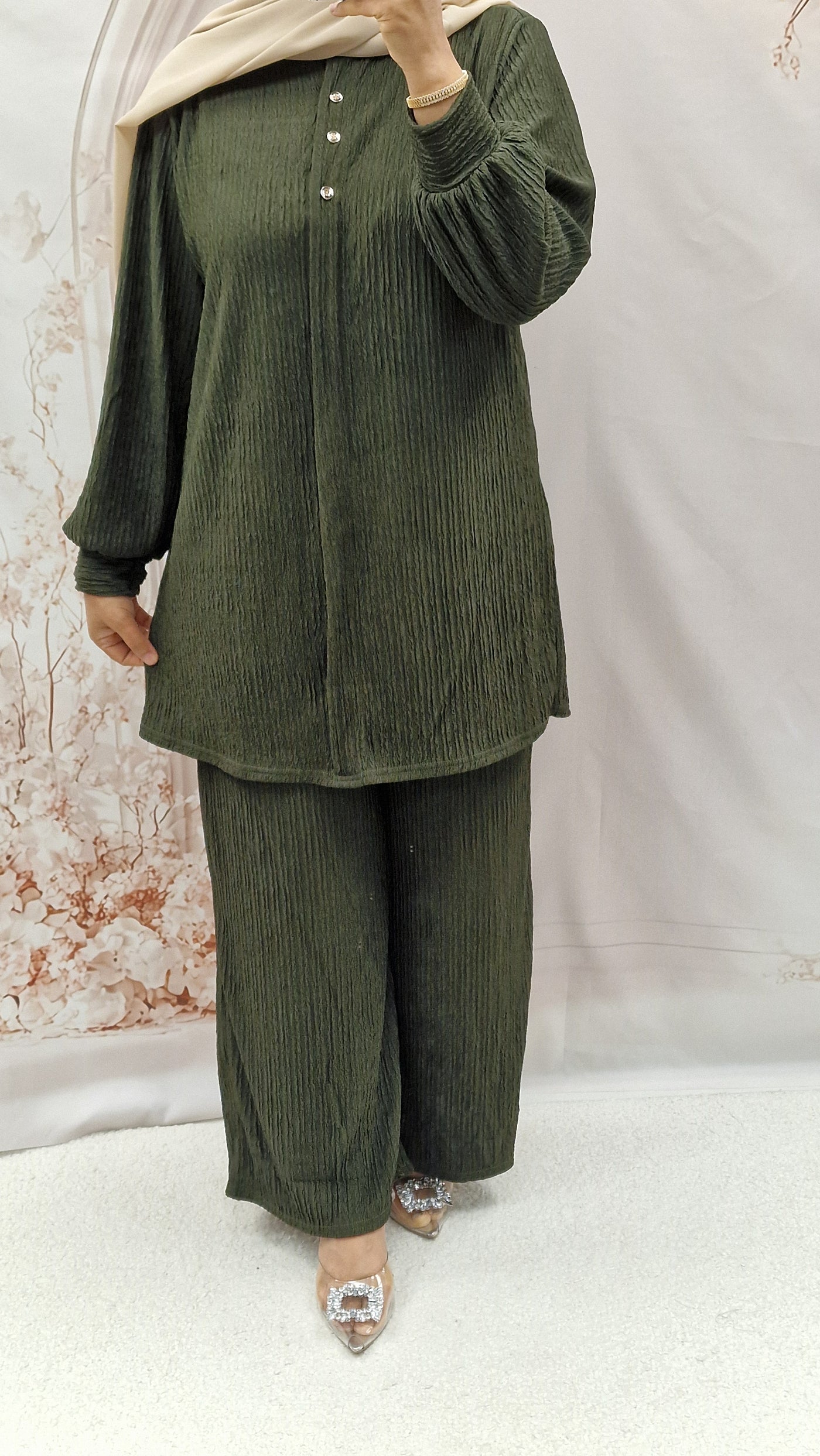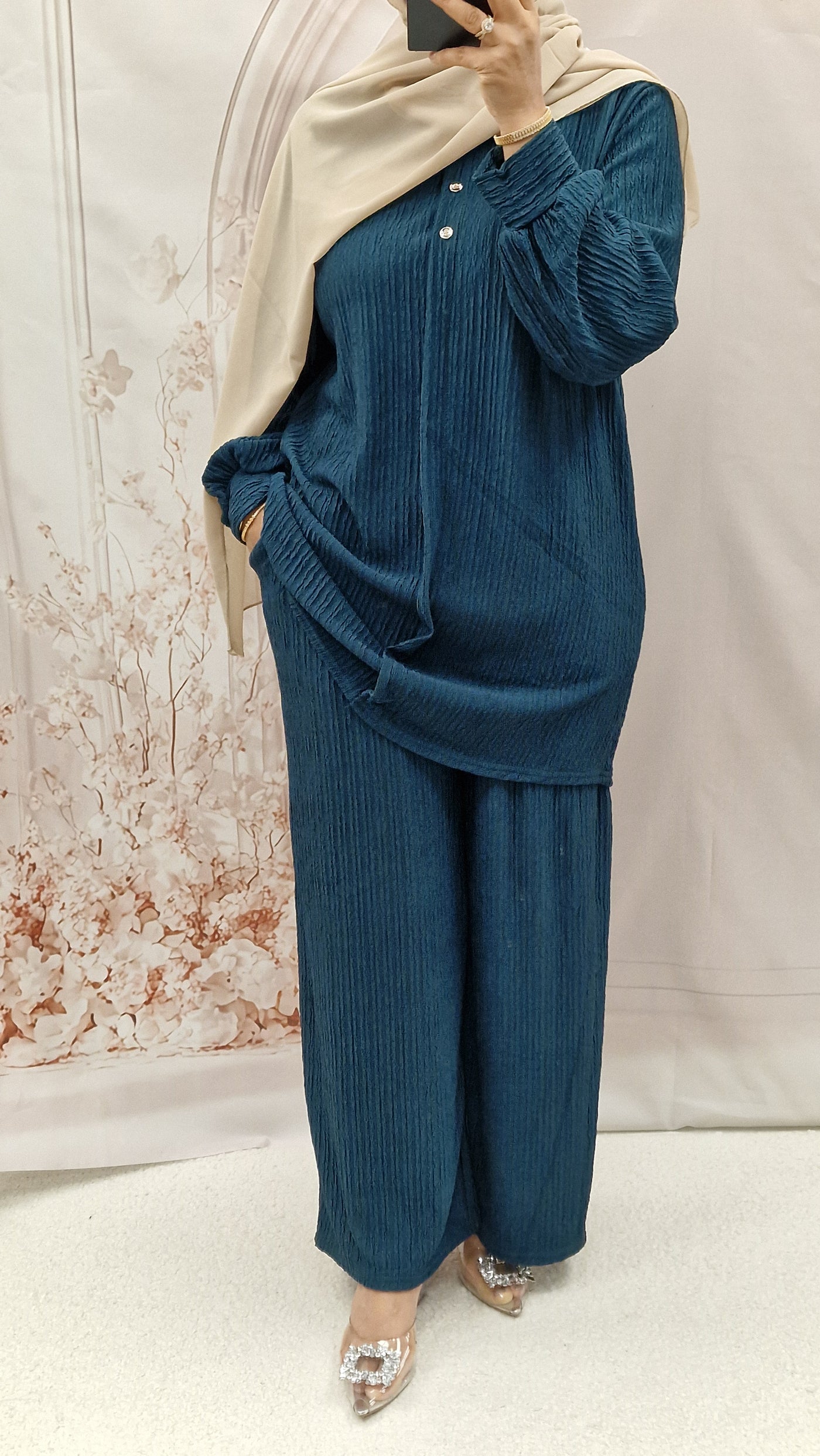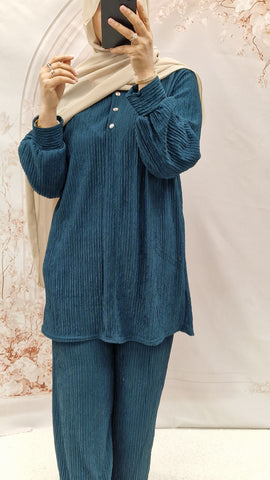 You will love this trendy co.ord set. Top is loose fit with rounded neckline and a decorative buttons. Comfortable trousers with pockets.