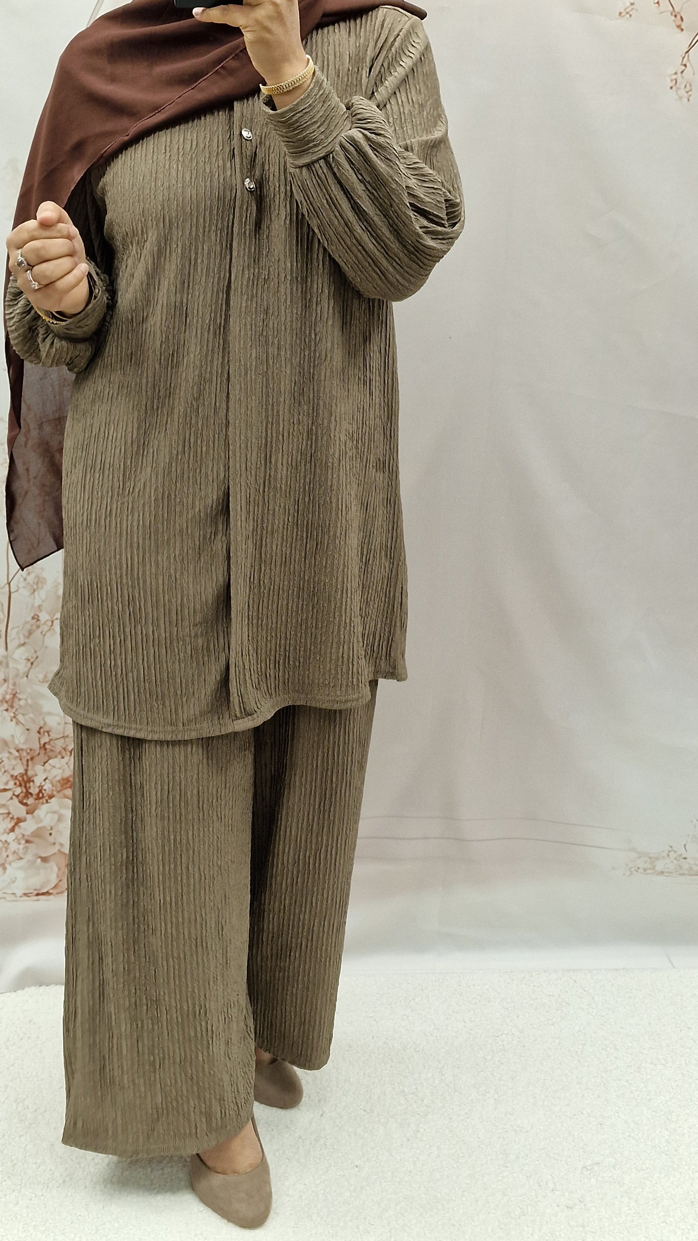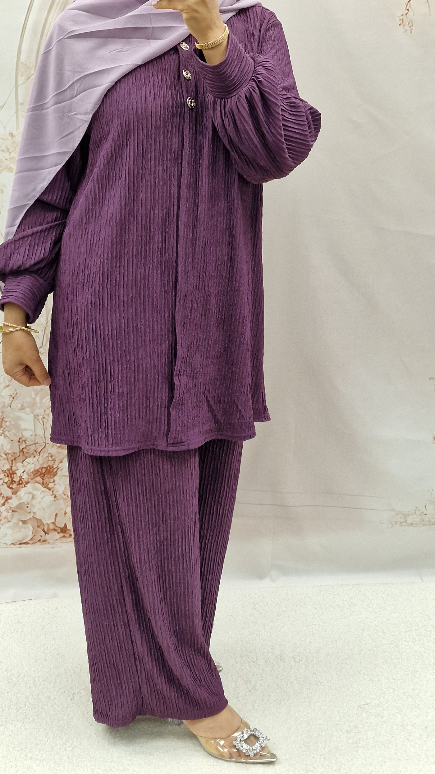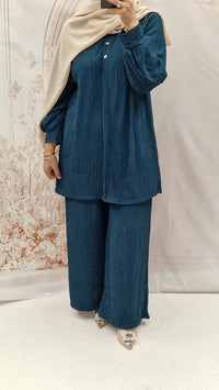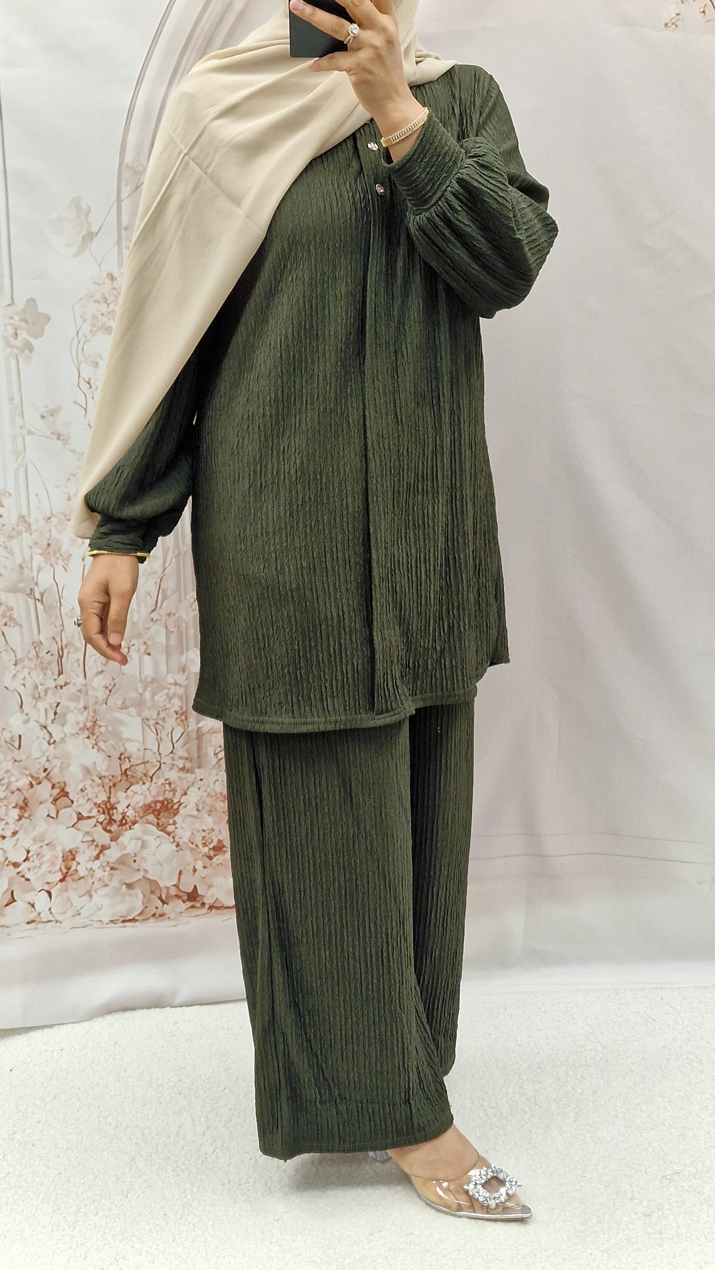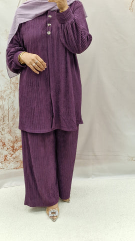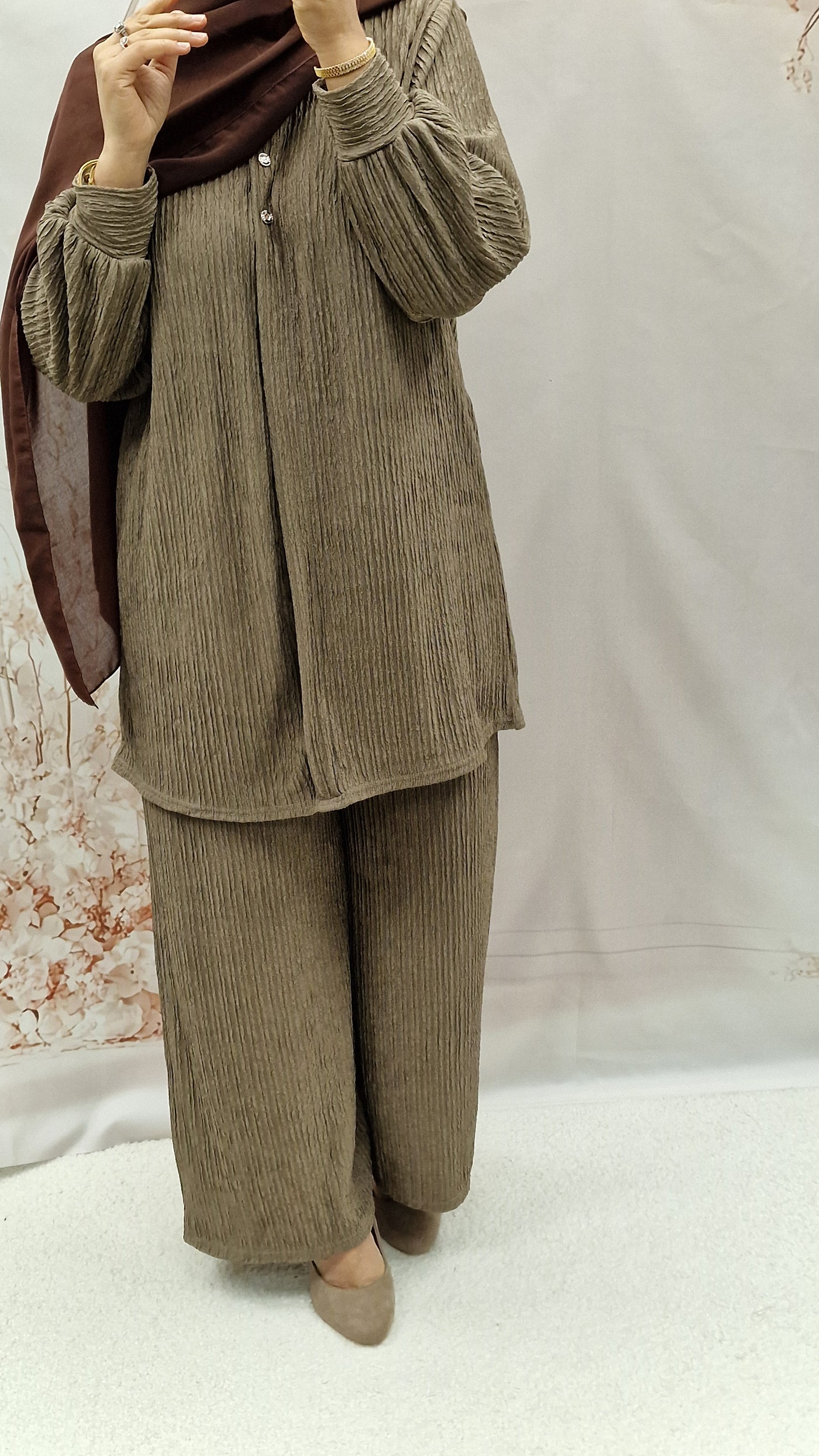You will love this trendy co.ord set. Top is loose fit with rounded neckline and a decorative buttons. Comfortable trousers with pockets.