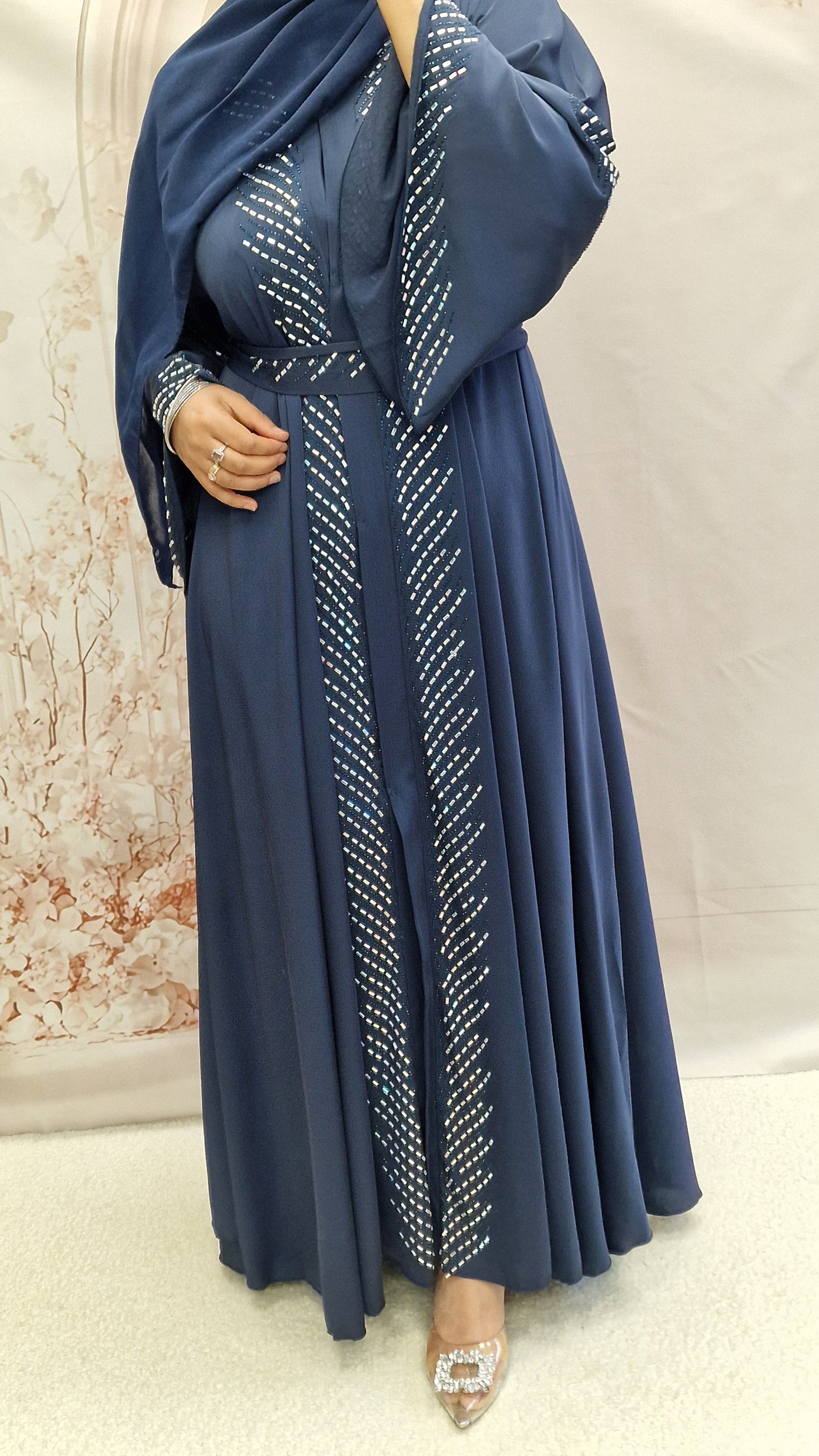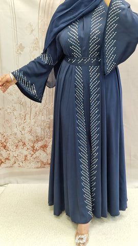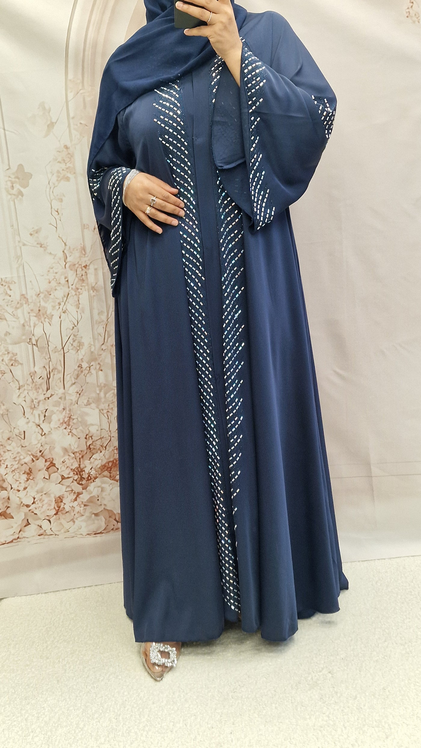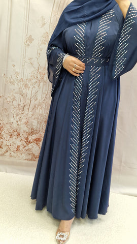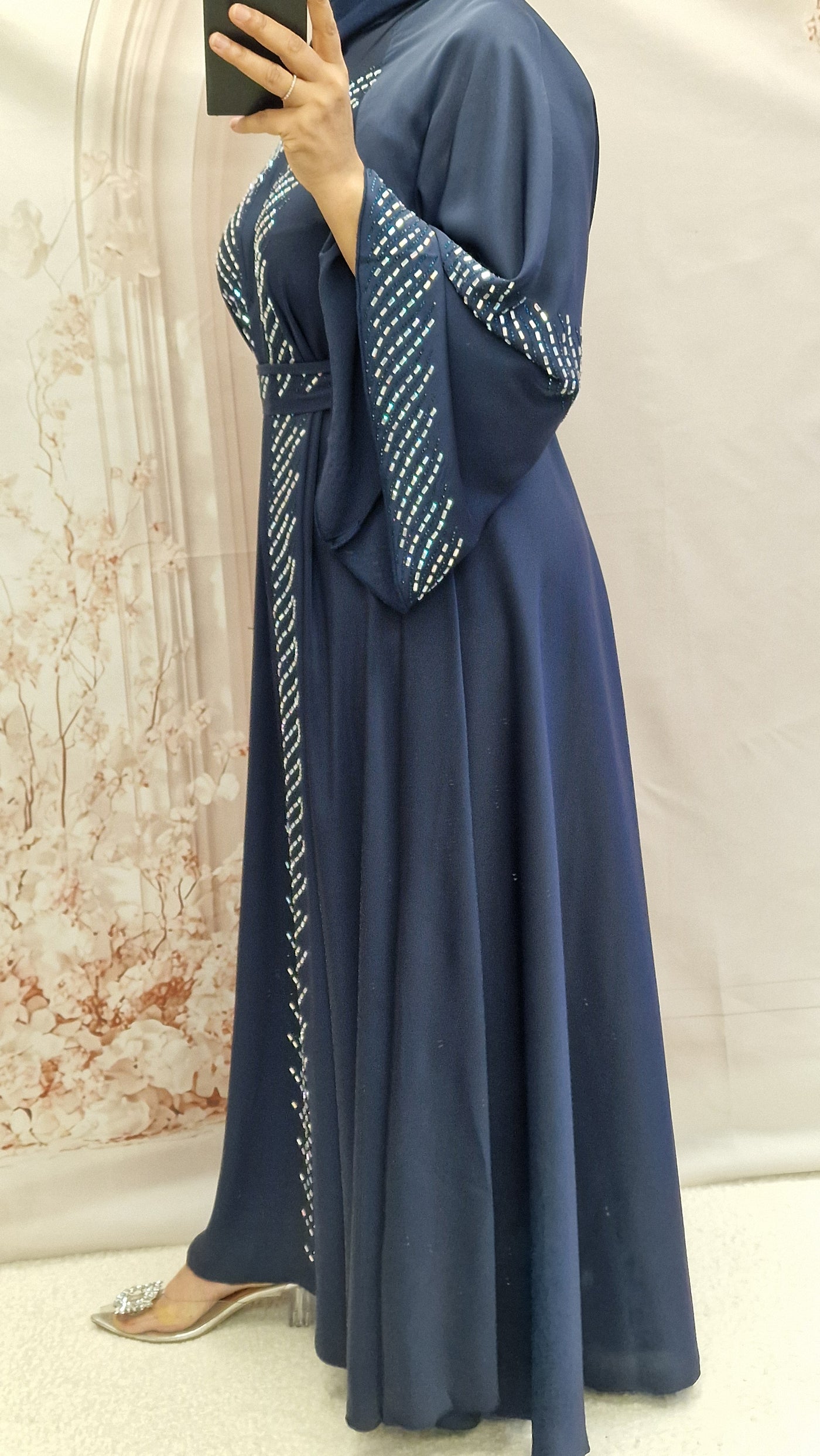 Arisa our new addition to the occassion wear range. This beautil umbrella style abaya with button fastening. Embellishment detail along the front and on the sleeves. The abaya can be worn as a closed abaya with its flowy umbrella style especially suited to our curvy sisters, it also has button fastening hence can be styled as a open abaya.