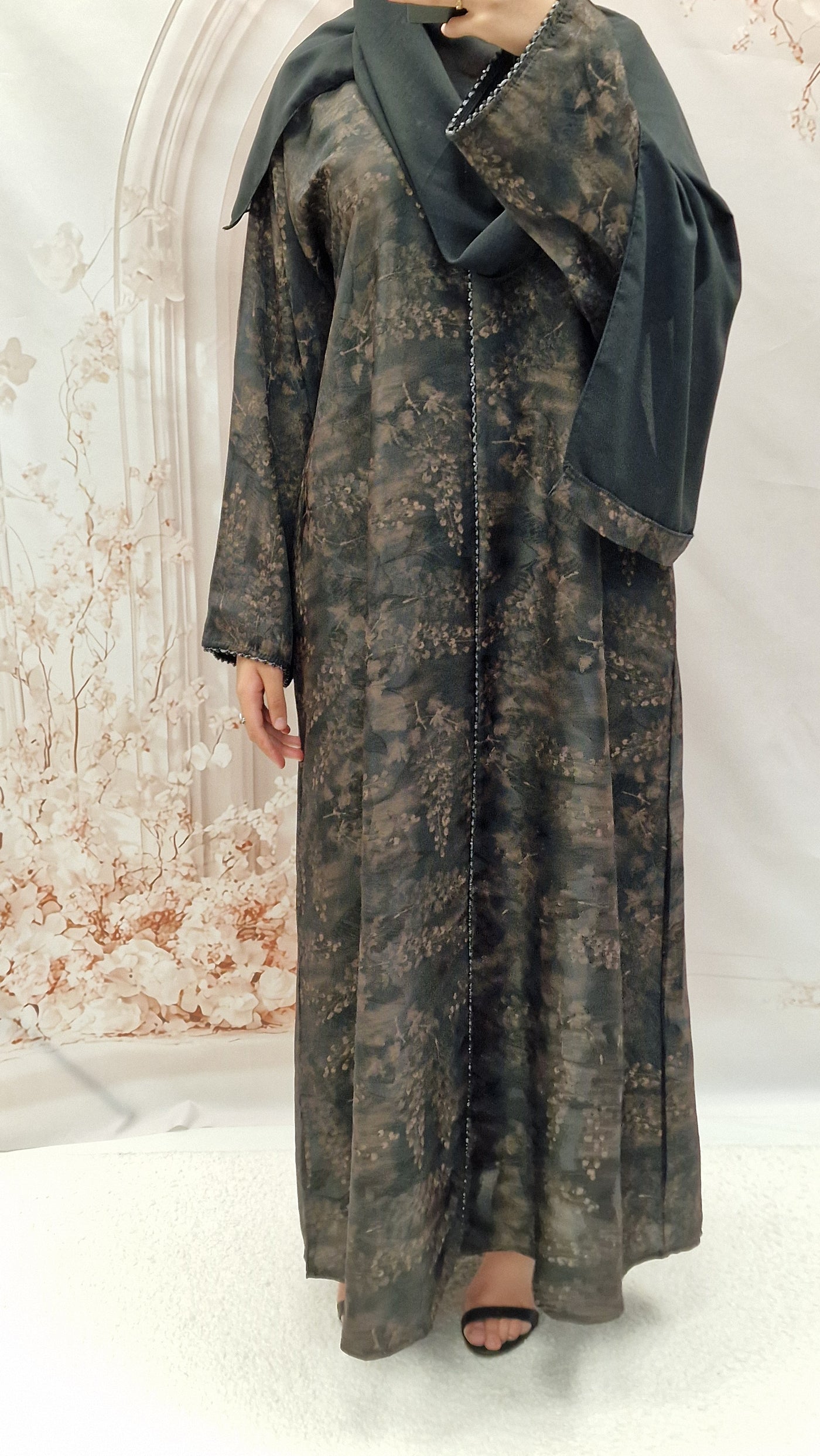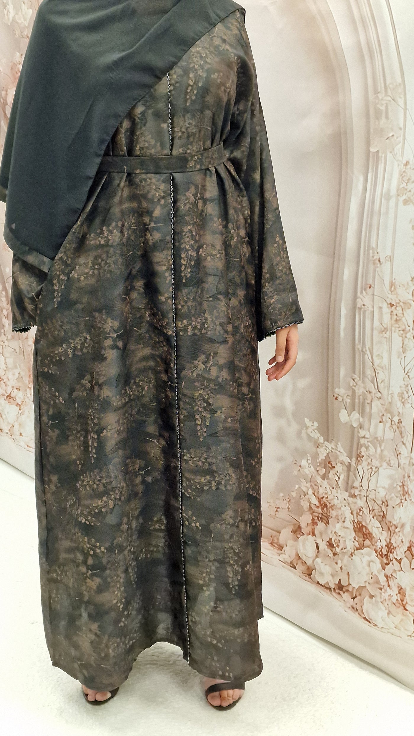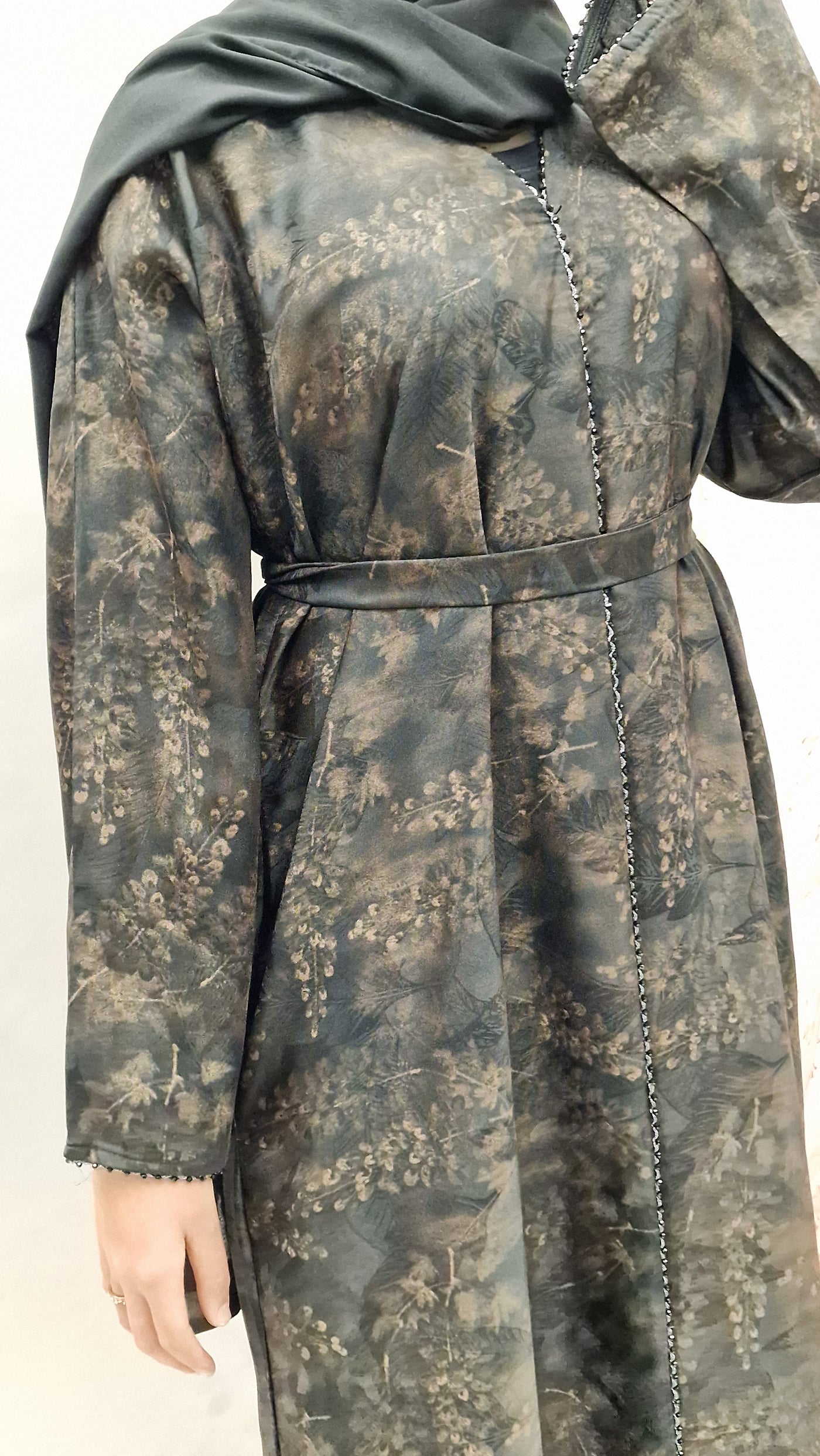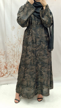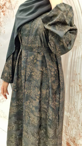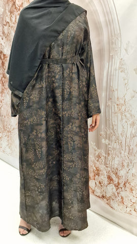 The stylish self print abaya, striaght cut style, wide sleeves, and a detachable belt . This comes complete with a complimentary hijab .