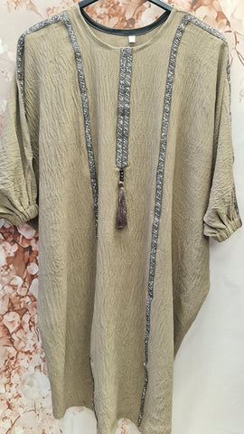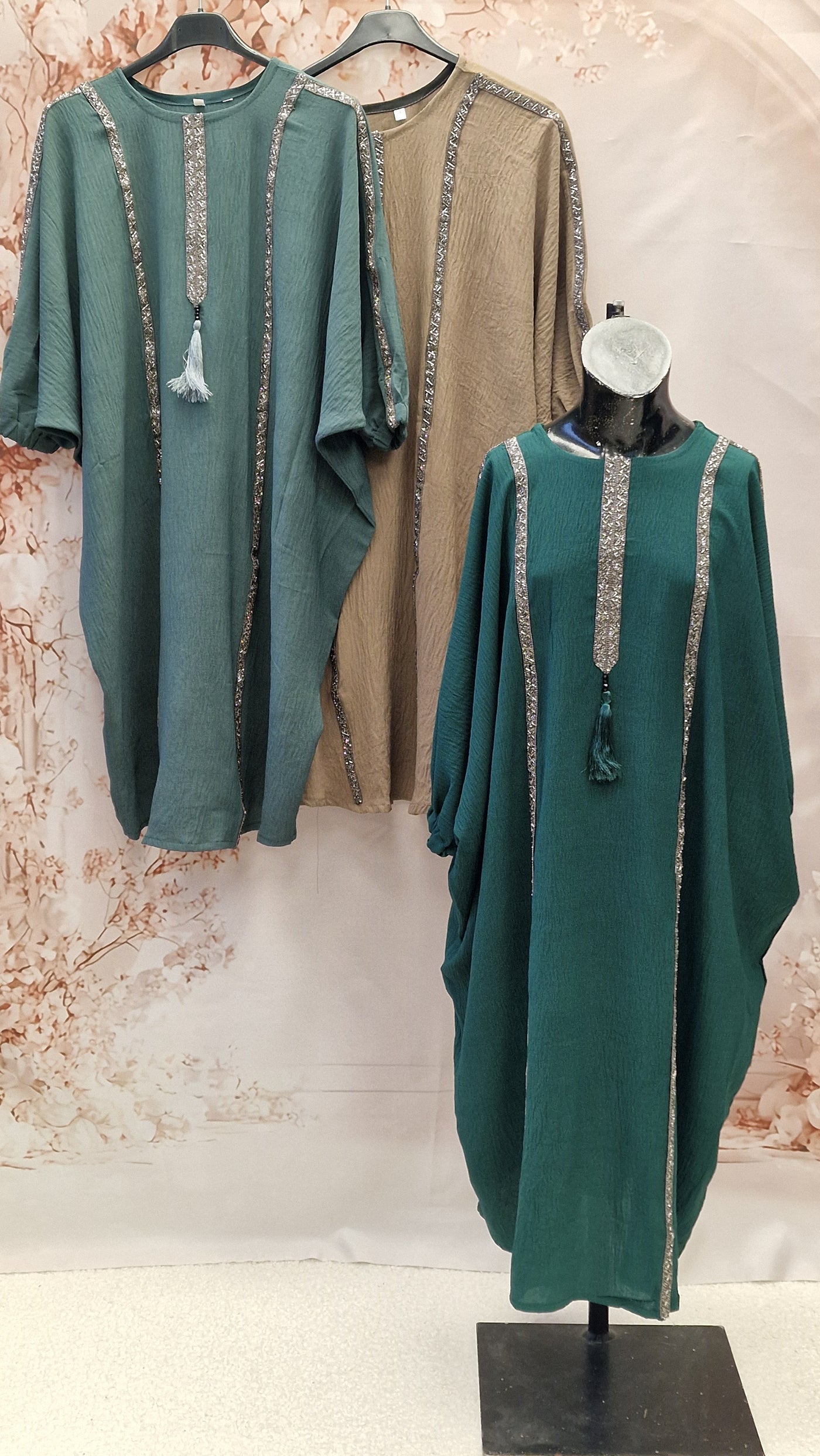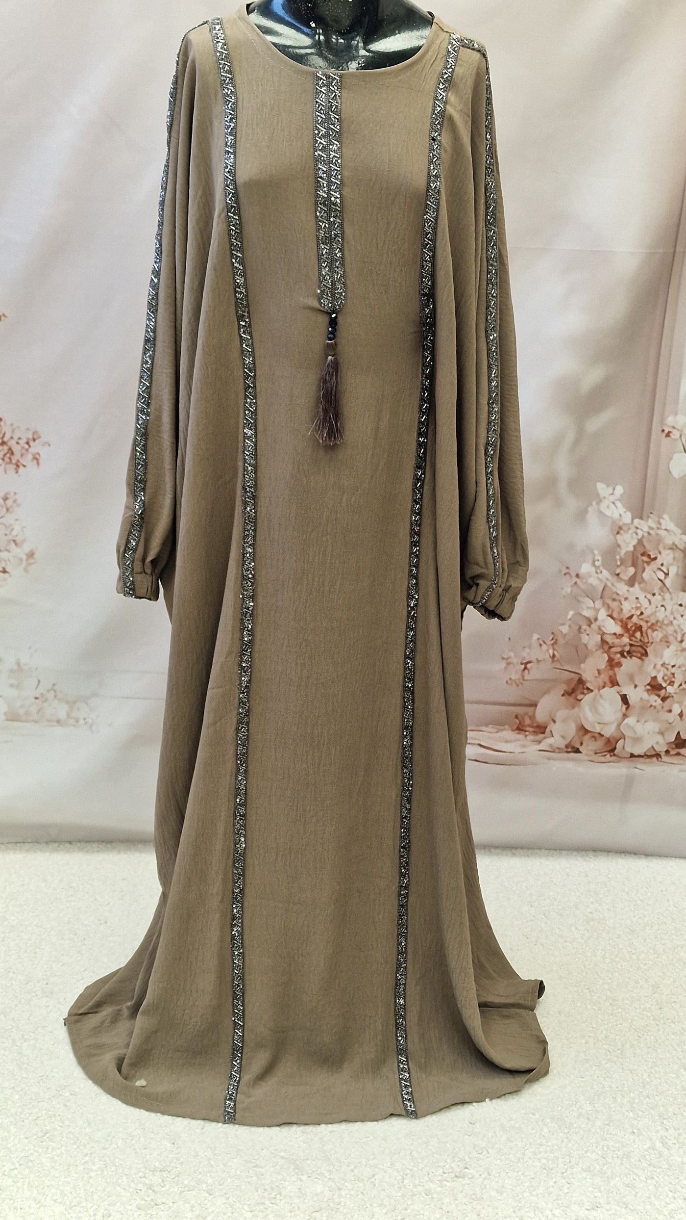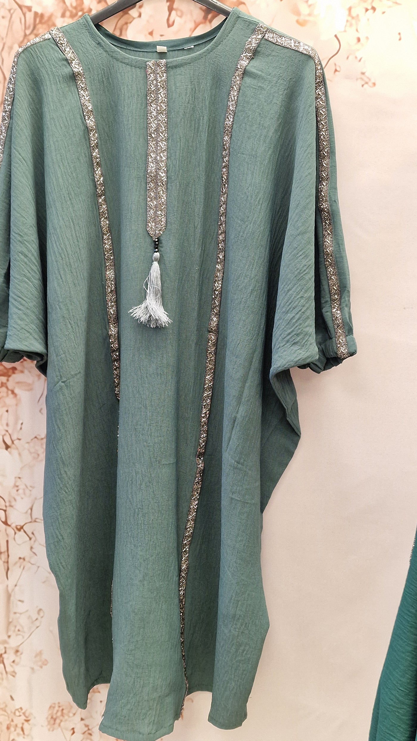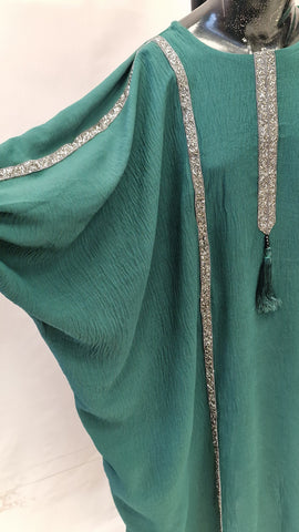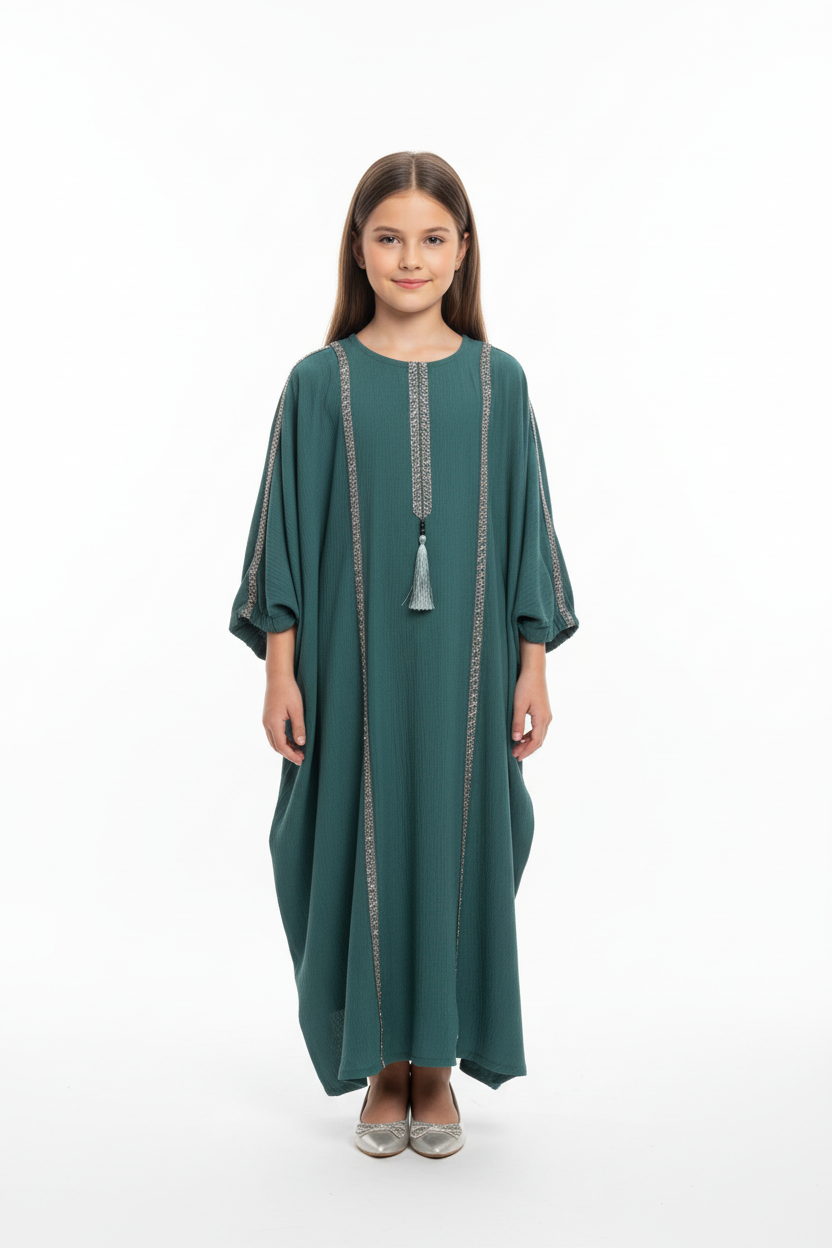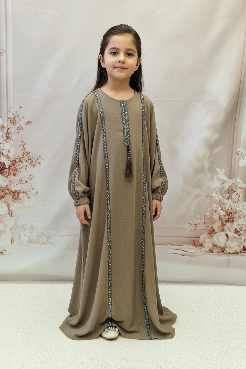 Beautiful abayas for your little princess. This is a kaftan style abaya with a inner belt . Lovely sequence around the neckline and running along the front. Rounded neckline with elasticated cuffs.
