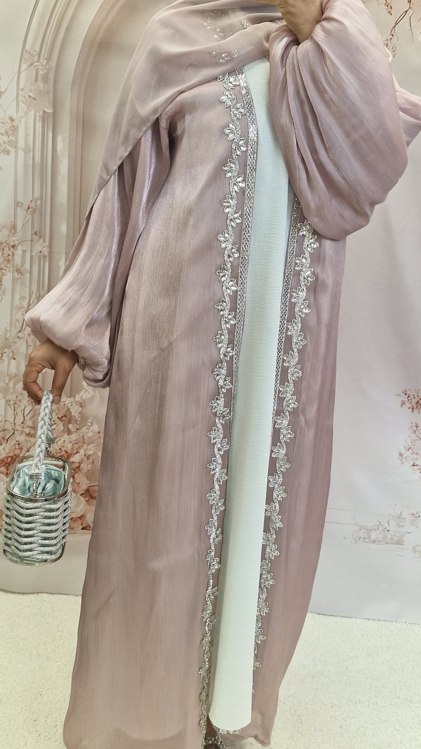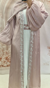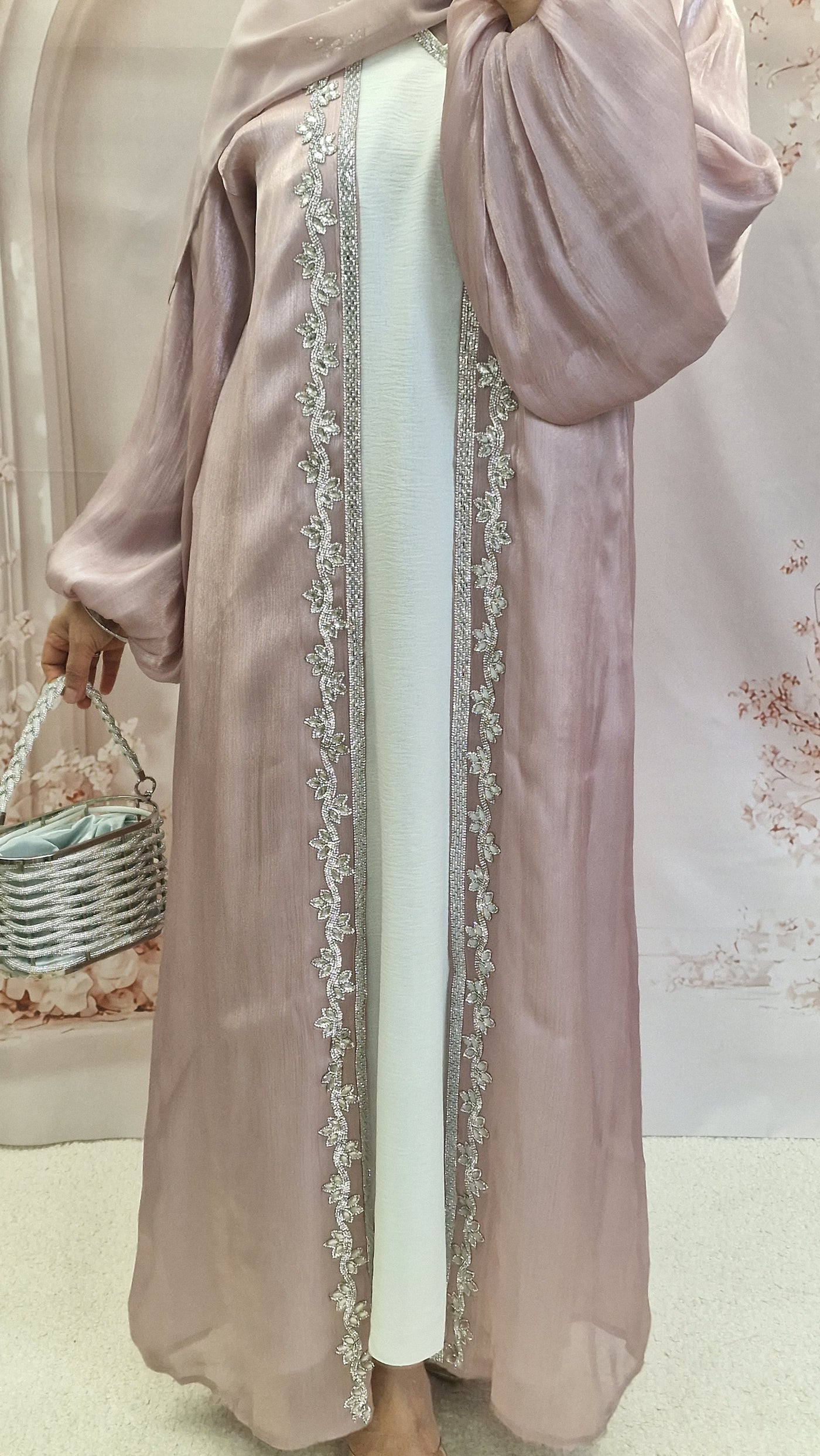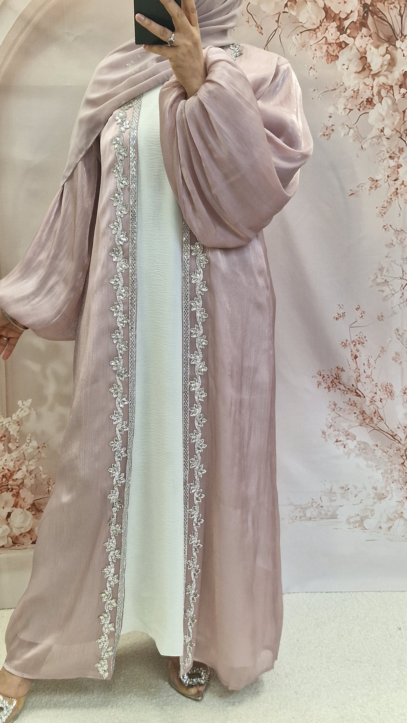 The outfit is a flowing, elegant ensemble. The inner slip dress is a white with a vneckline, over this drapes a soft, dusty rose-colored overcoat . The outer layer has a silky, shimmering quality to the fabric, a luxurious silky fabric.