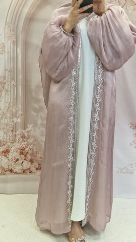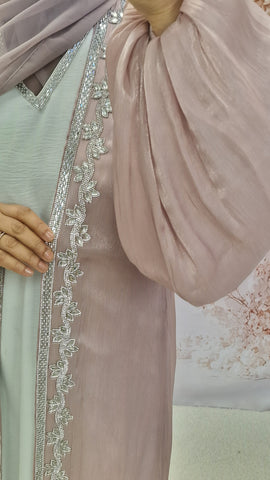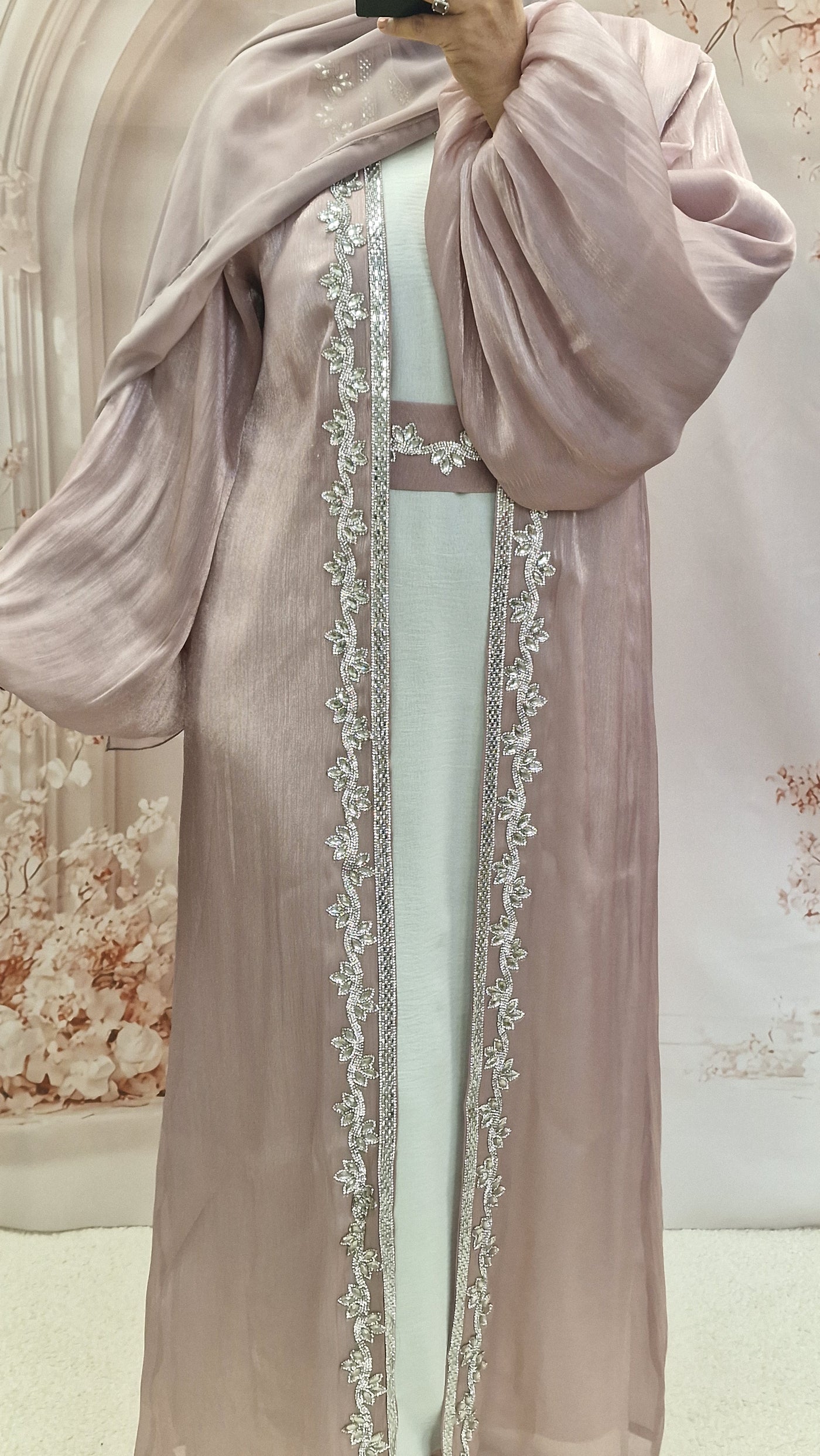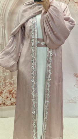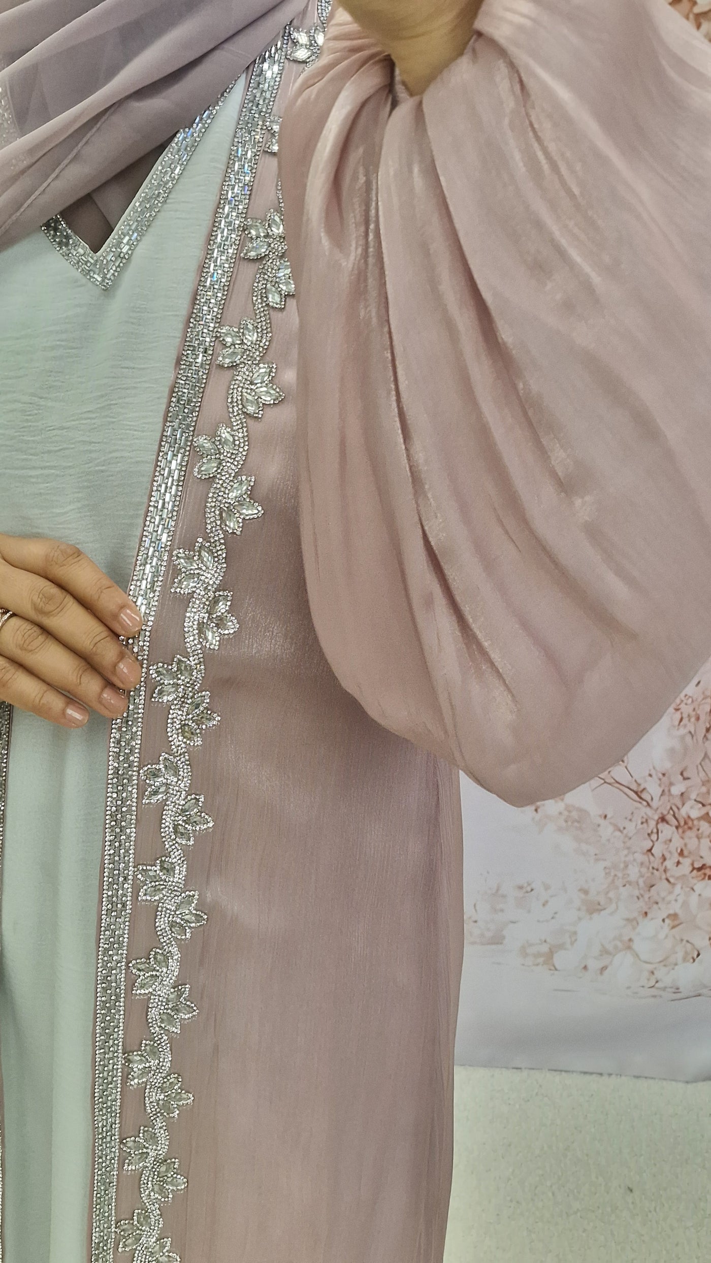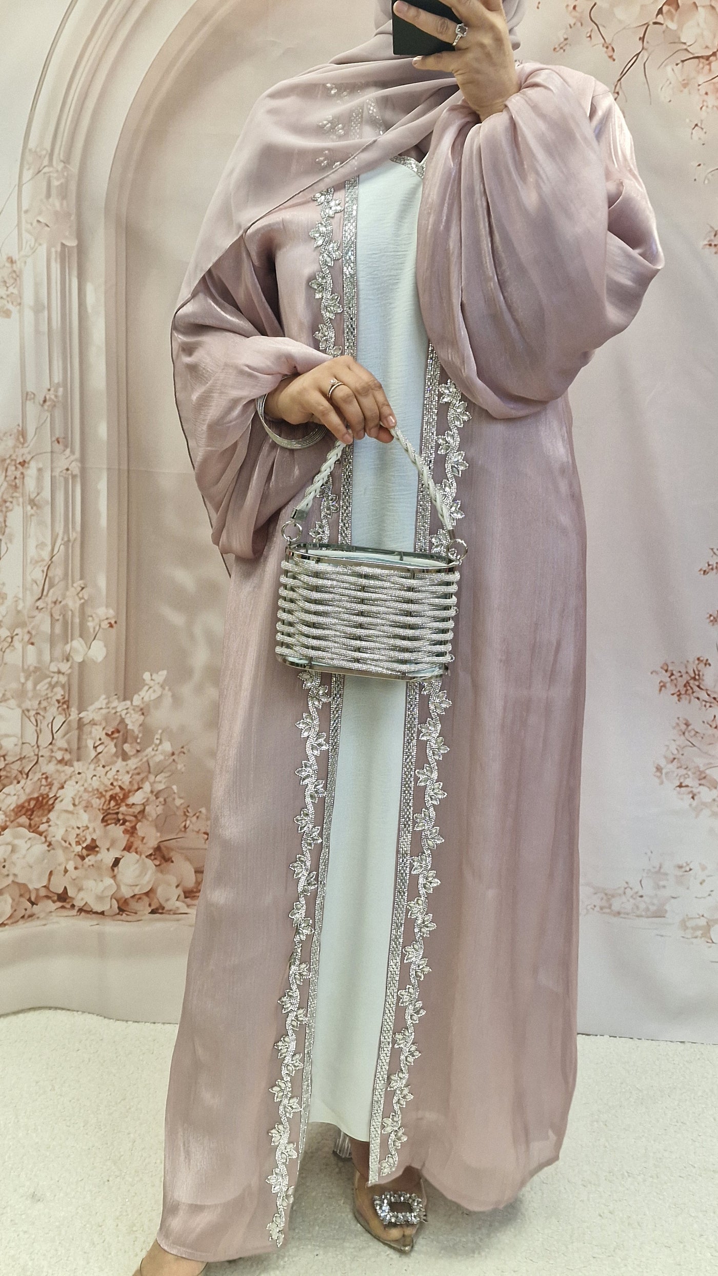 The outfit is a flowing, elegant ensemble. The inner slip dress is a white with a vneckline, over this drapes a soft, dusty rose-colored overcoat . The outer layer has a silky, shimmering quality to the fabric, a luxurious silky fabric.