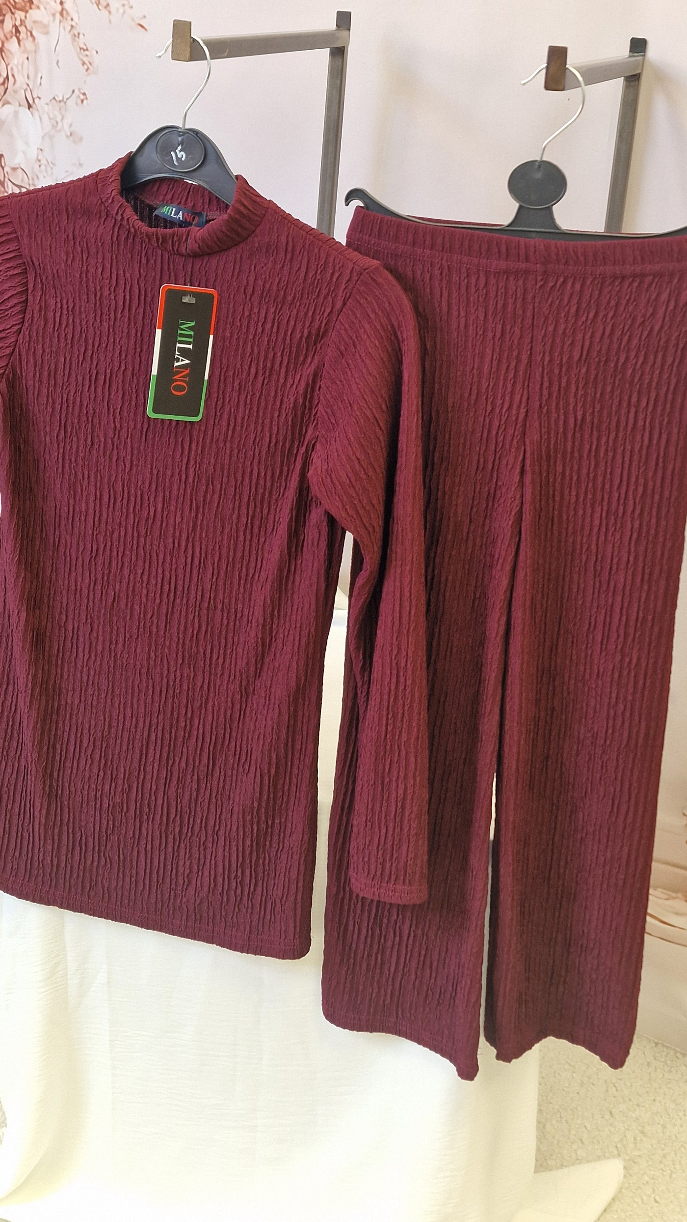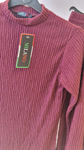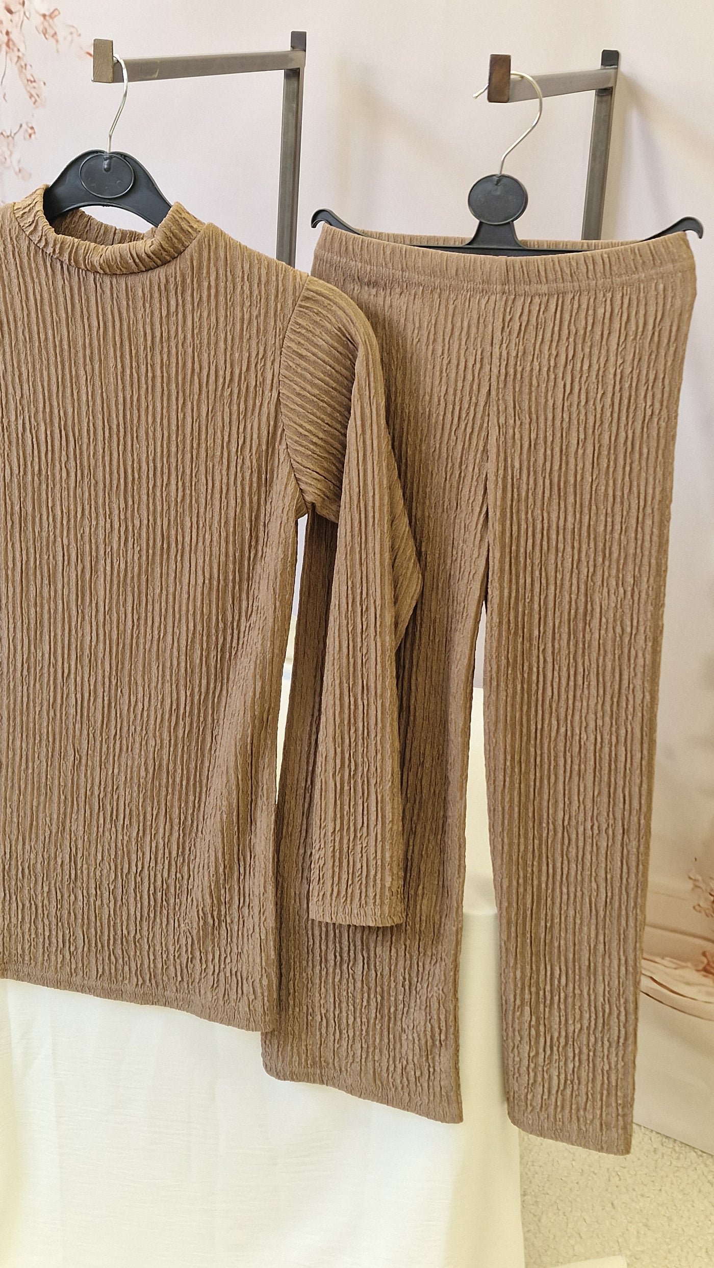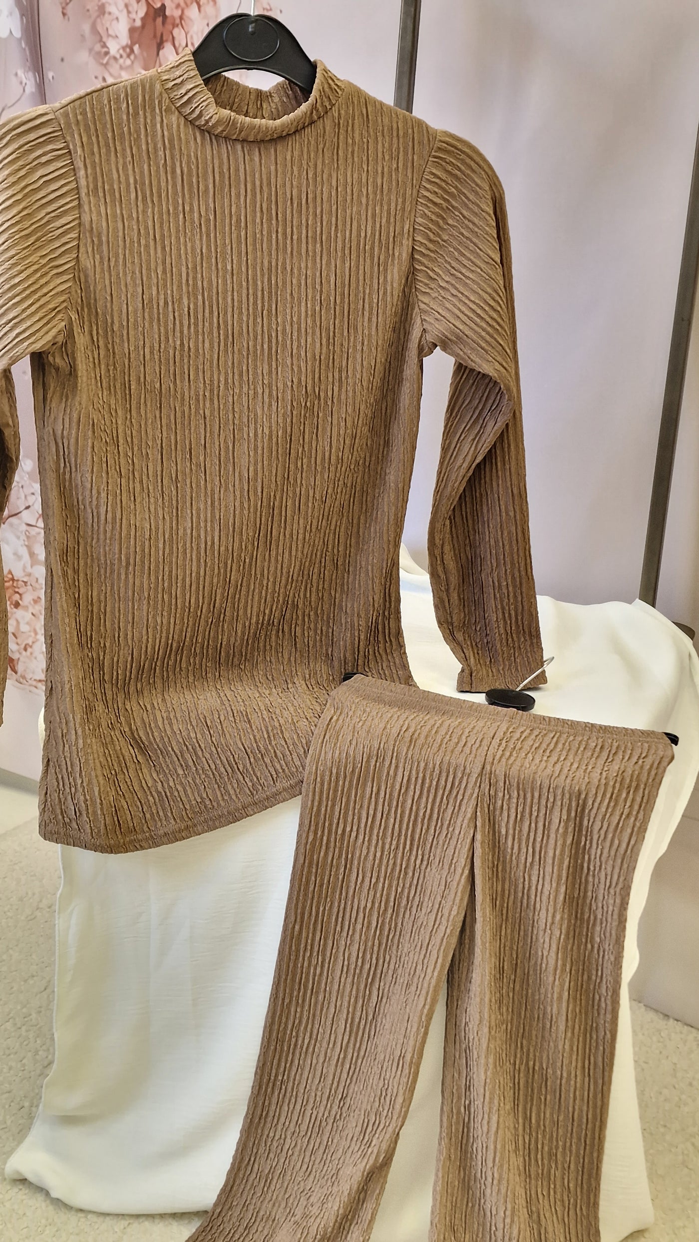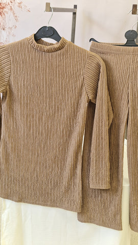 Girls co ord set . Top with rounded neckline, striaght sleeves. The trouers have a elasticated waist.