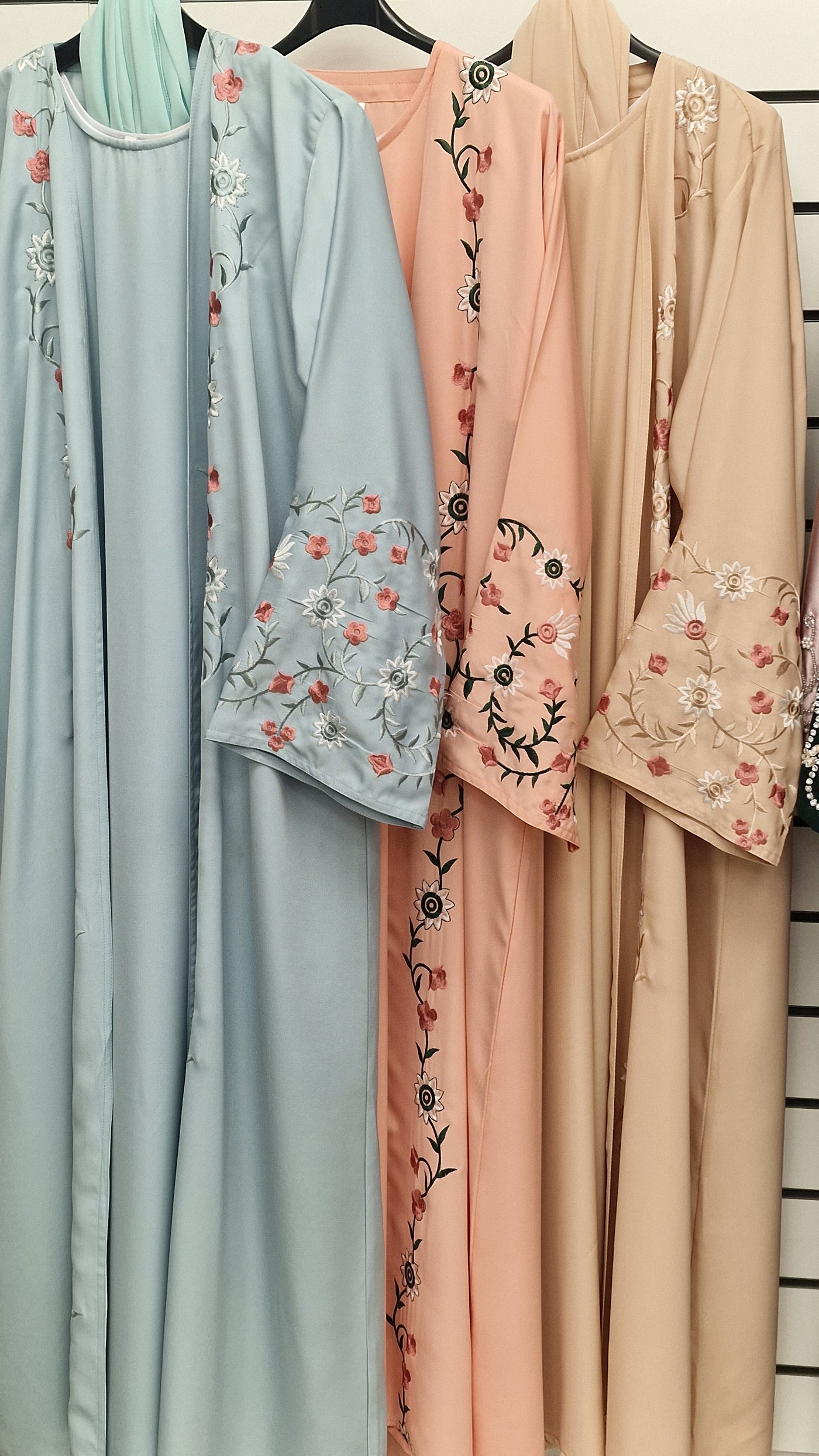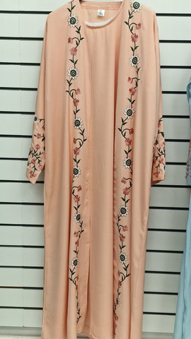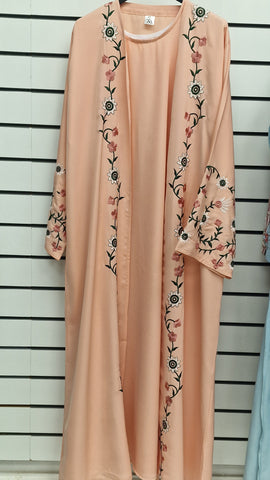 The new addition to our open abaya collection . Beautful thread embroidery running along the front of the abaya and on sleeves paired with a plain inner slip and a matching hijab.Enjoy elegant and versatile styling options with this beautifully designed ensemble. Made from high-quality materials for a comfortable fit.