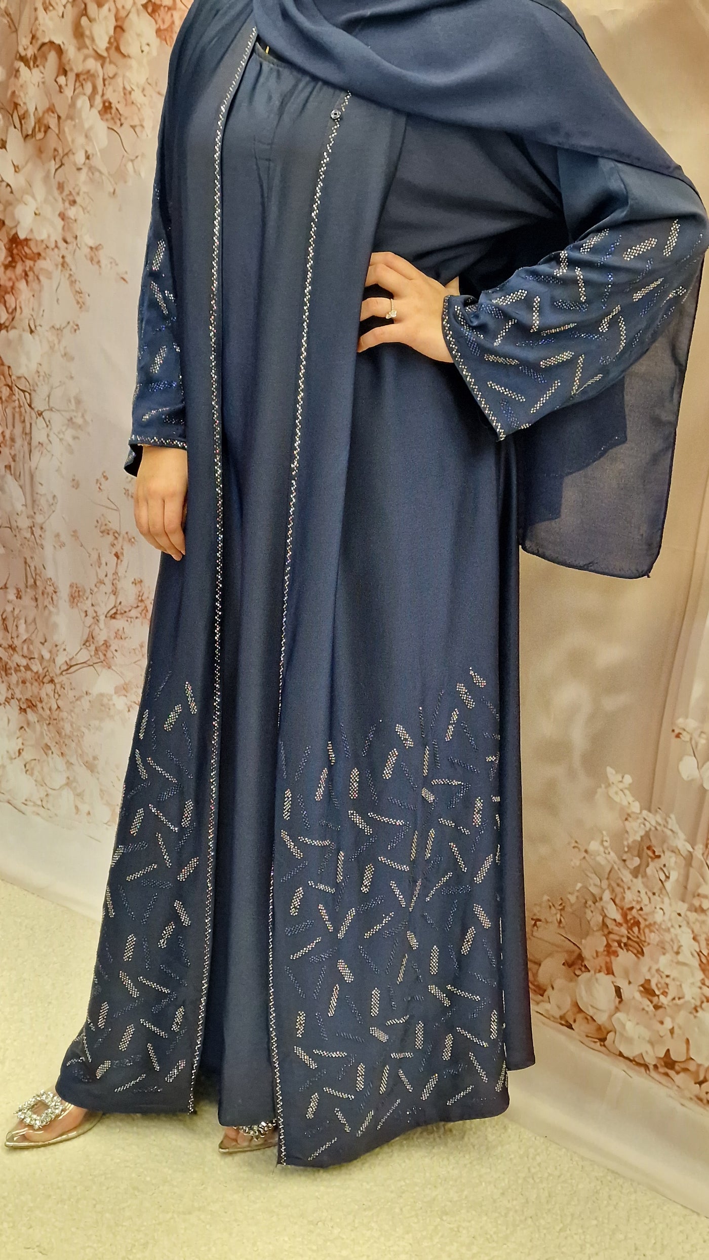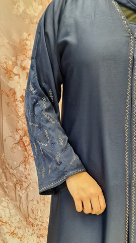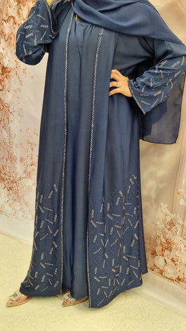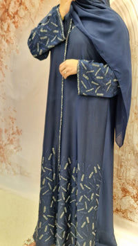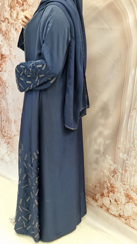 Our beautiful embellished open abaya style with a inner slip (attached )complimented with chiffon scarf.